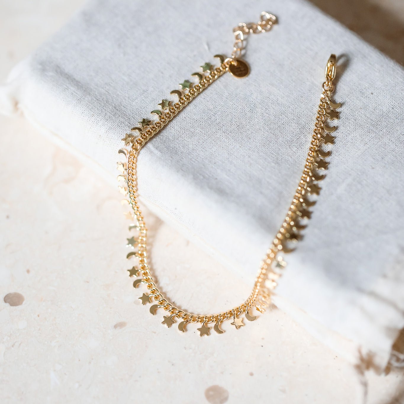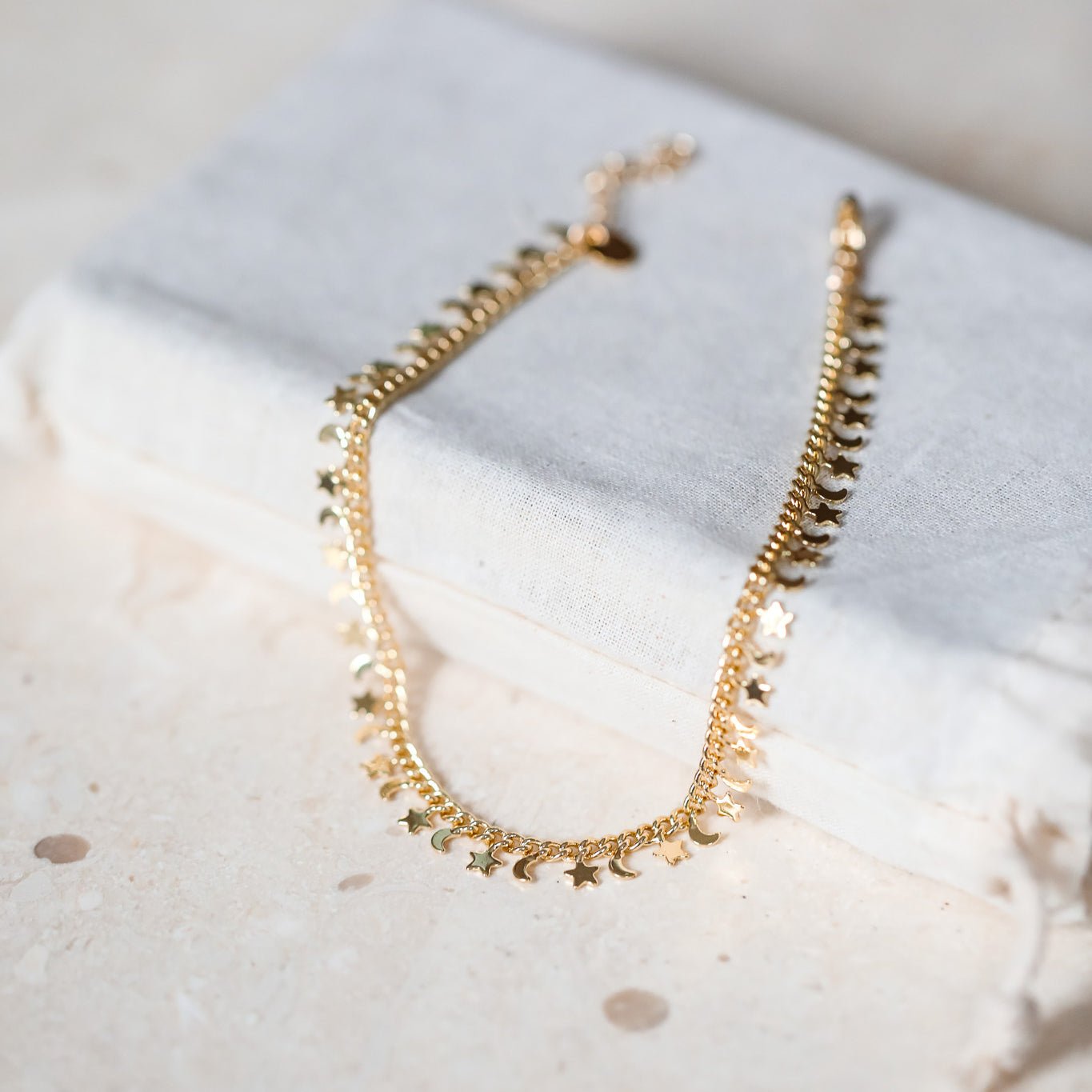 Just the right touch of witchy for the summer! A bright gold chain anklet with tiny star and moon charms.