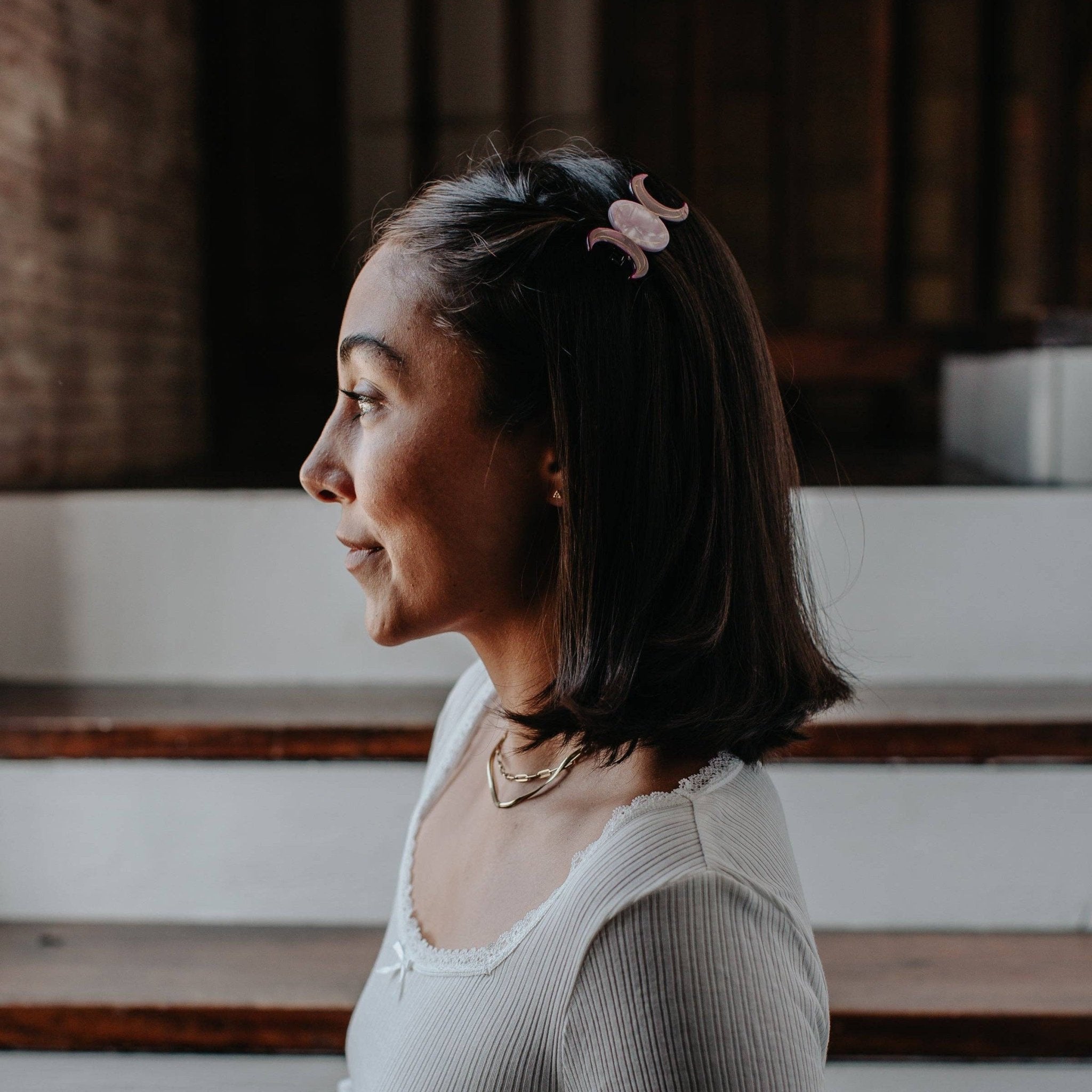 Backed with a non-slip french barrette, crescent moons surround a full, center moon in a swirling acetate with detailing engraving to catch the light.
