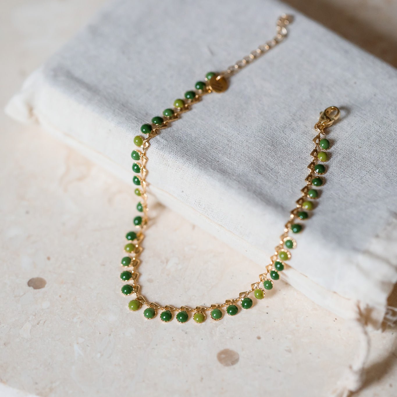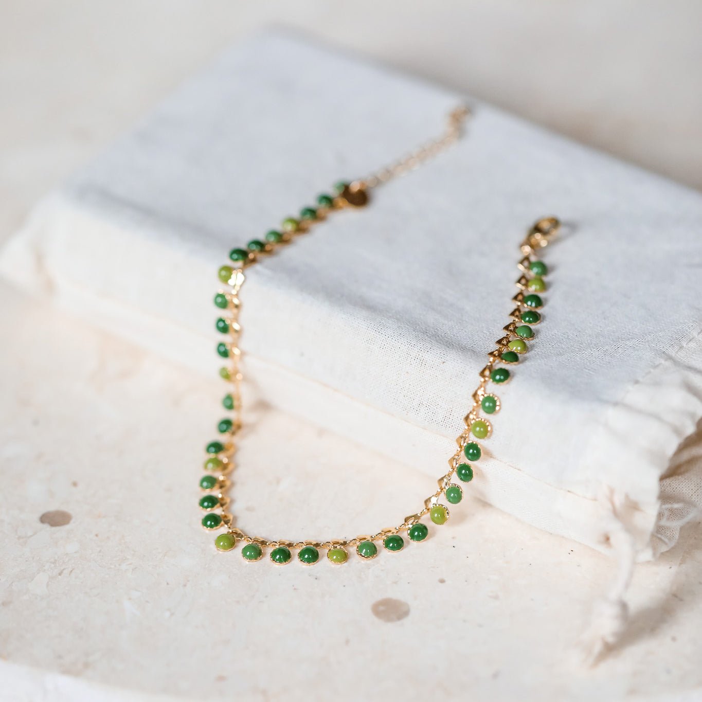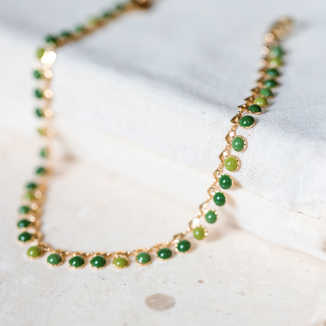 A gorgeous row of green-toned enamel beads on gold plated chain.