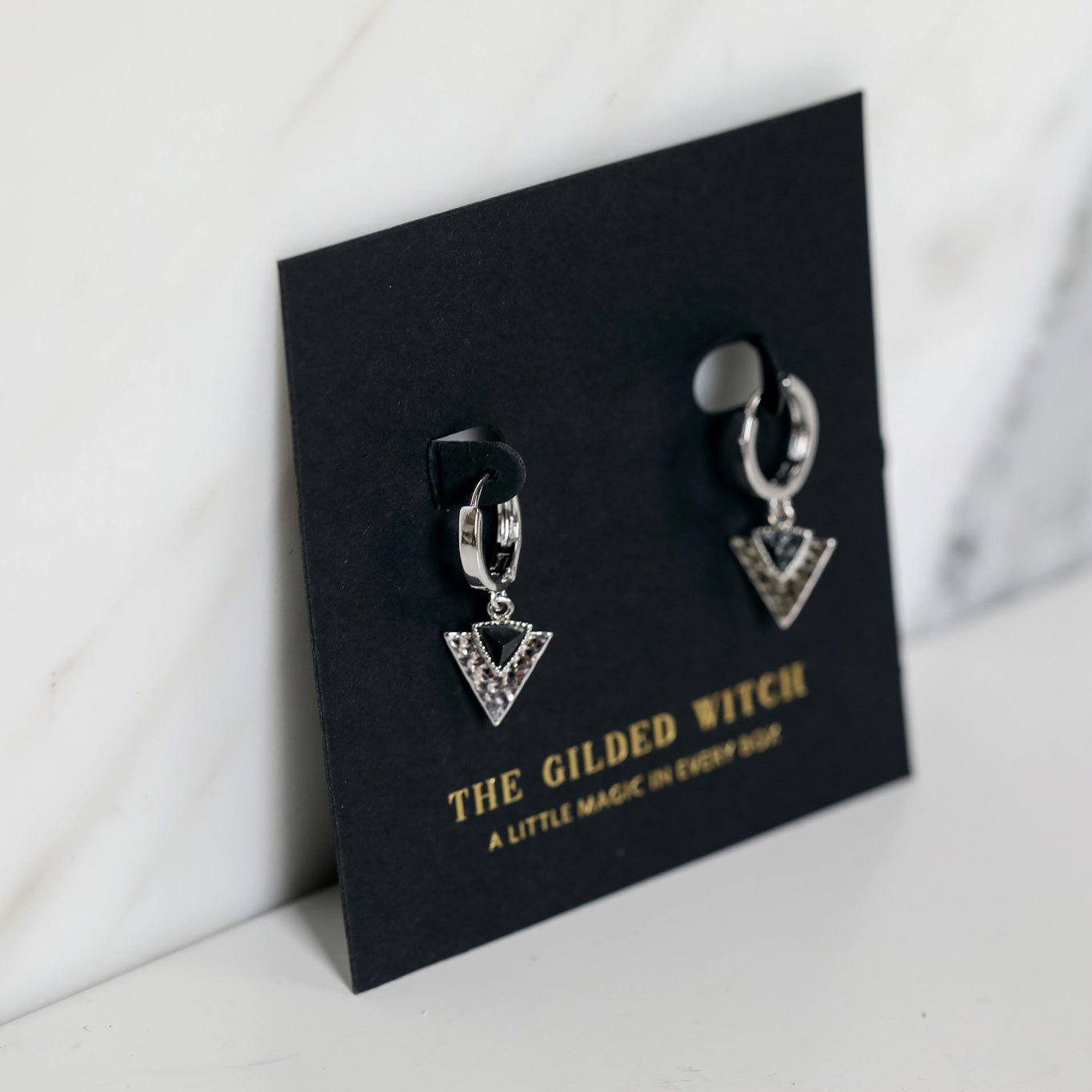 A pair of unique Black Marble triangle charm huggie earrings in silver.