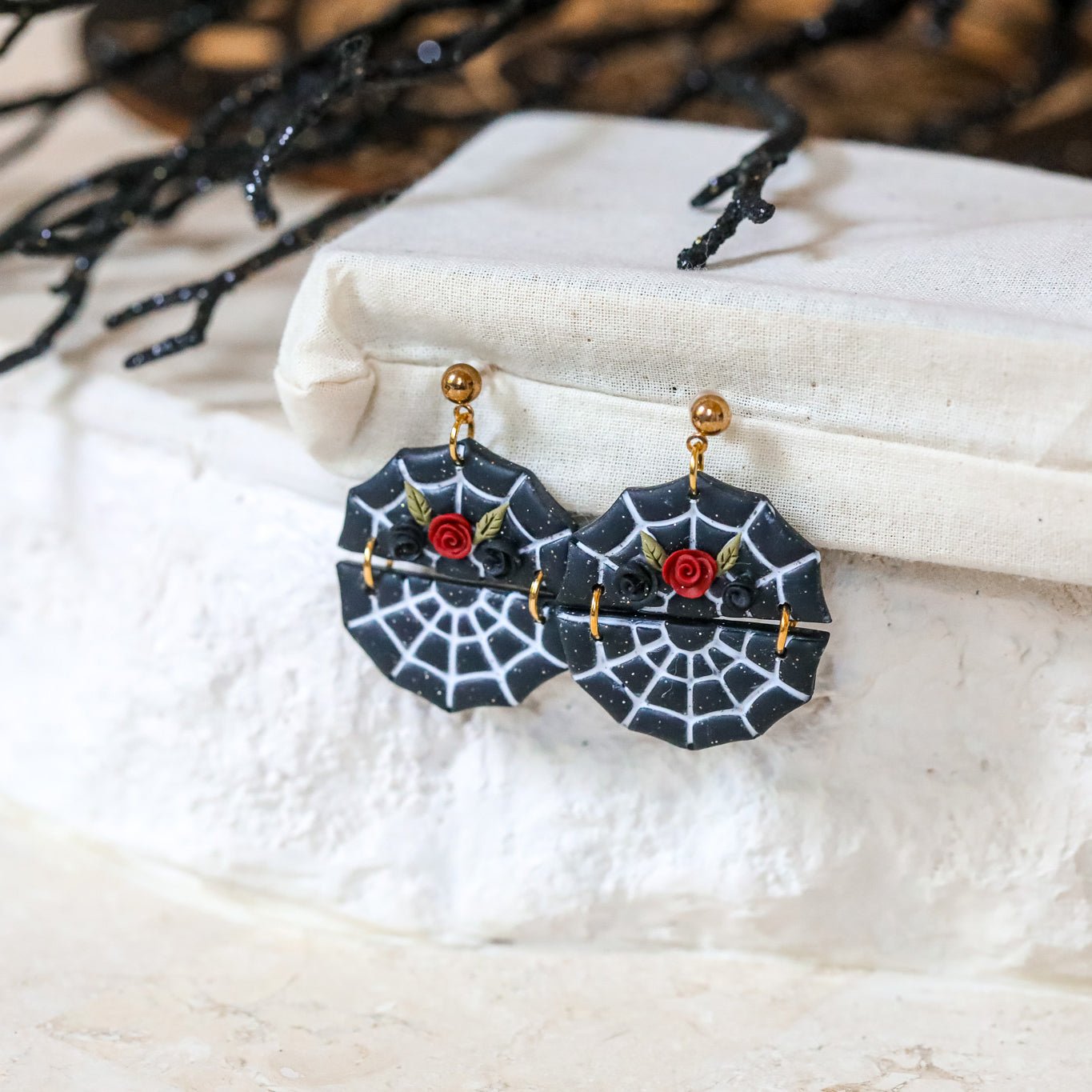 Calling all Halloween lovers! A gorgeous pair of black spiderweb earrings with red and black roses decorating the top. Handmade from clay by Everything Ky and I.
