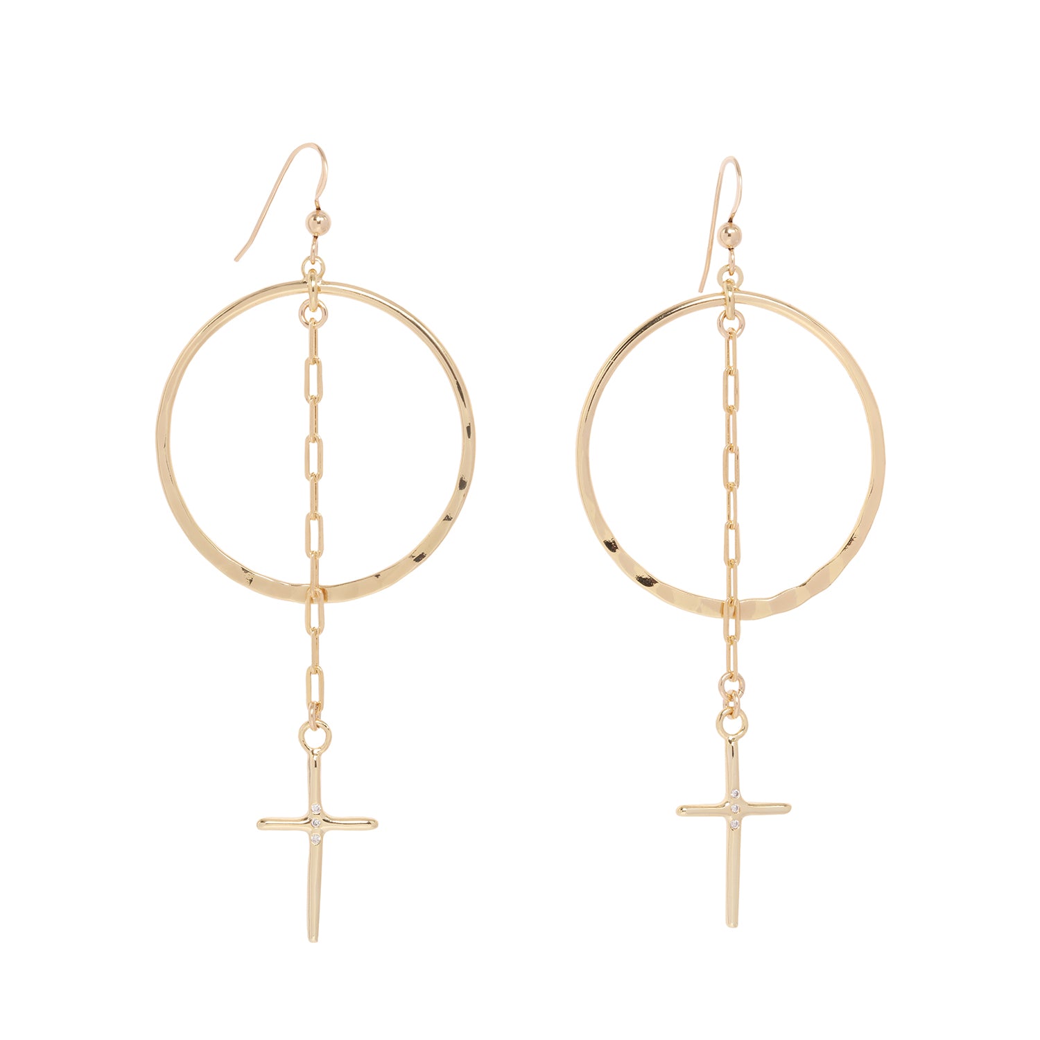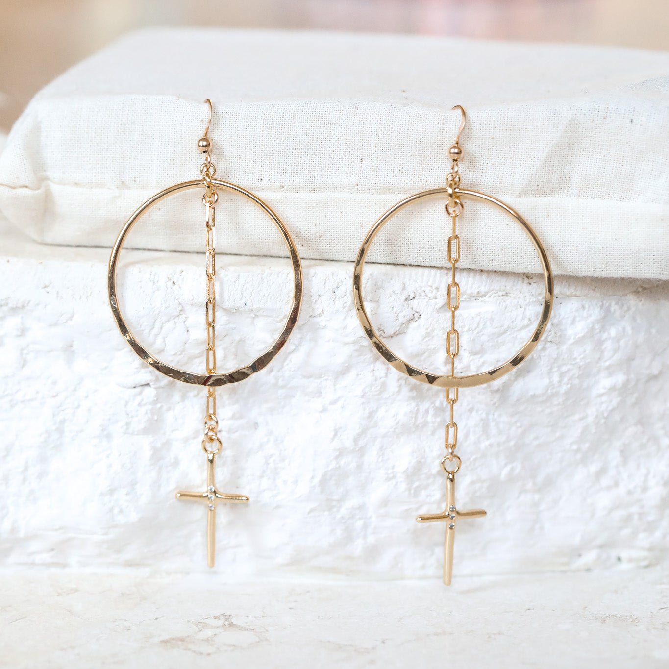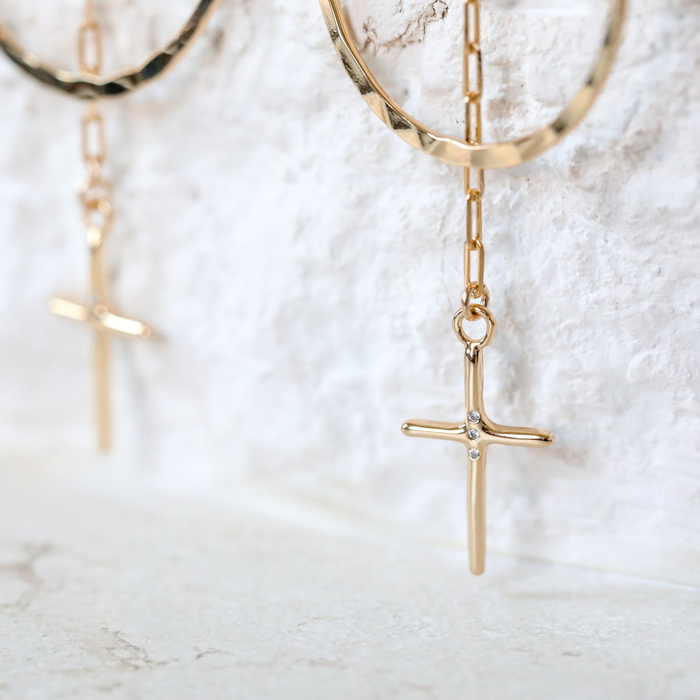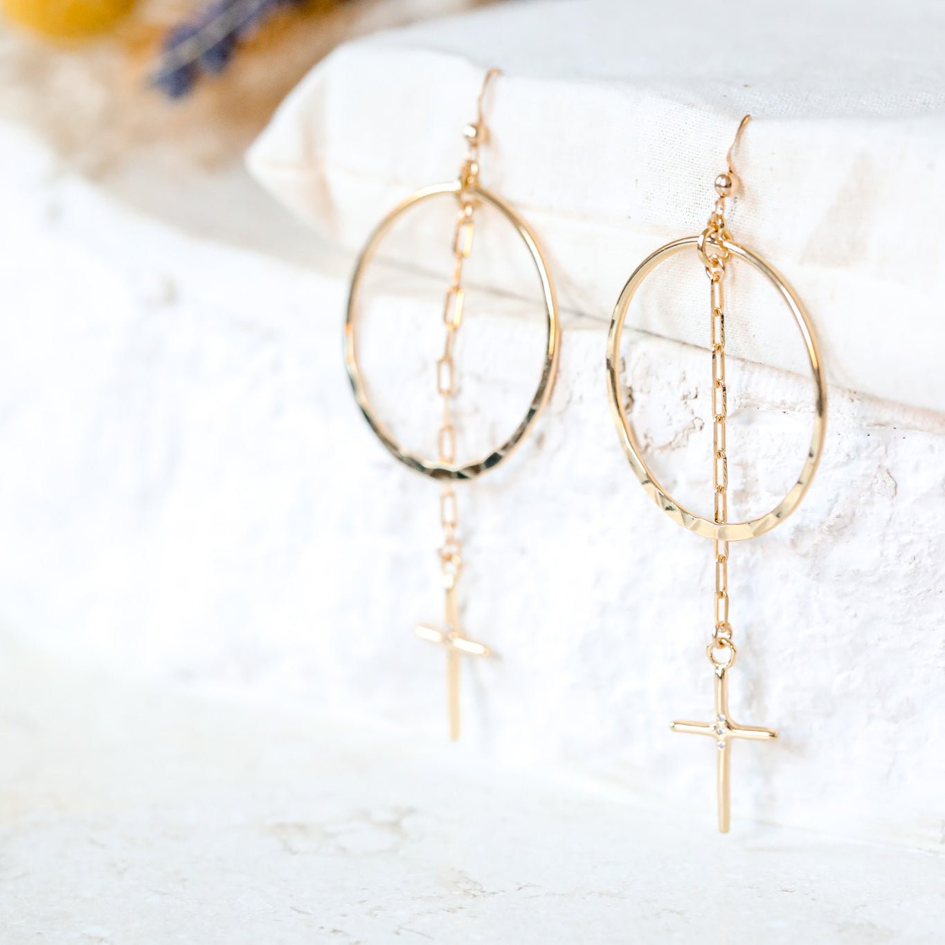 Statement earrings featuring vintage crosses, hoops and paperclip chain. Don't worry, they're lighter than they look!