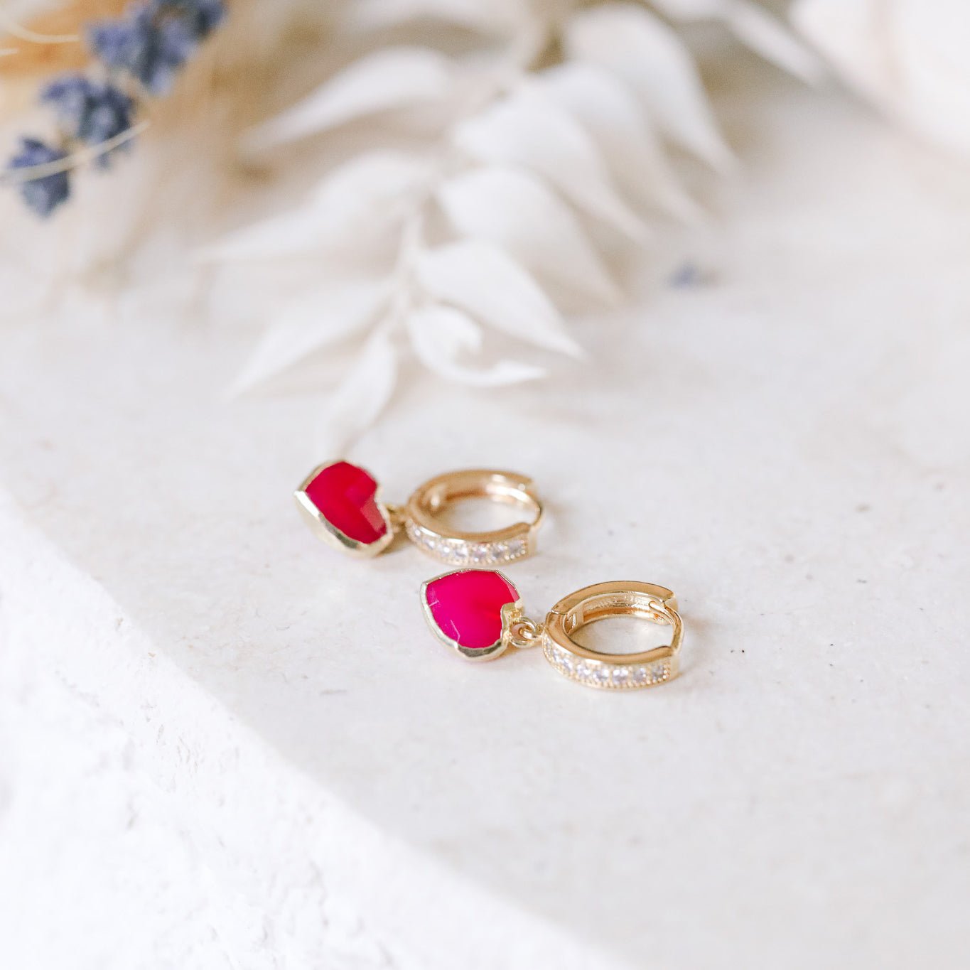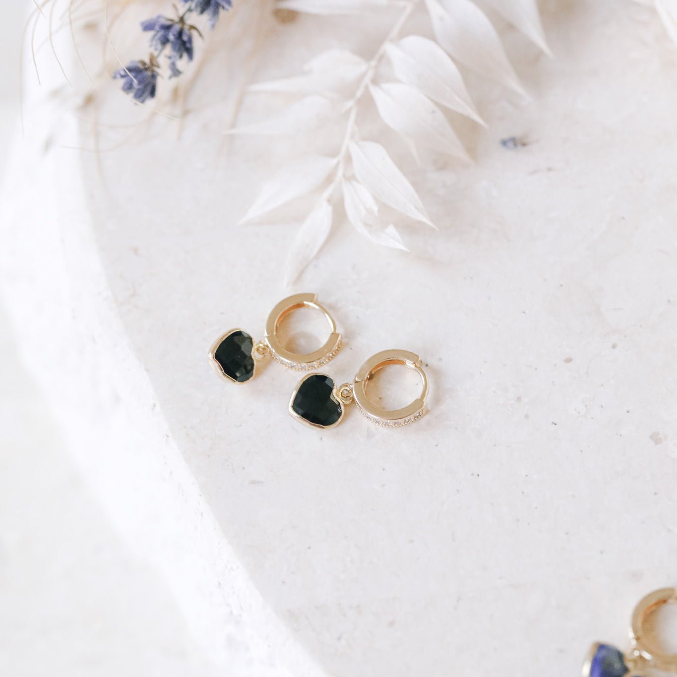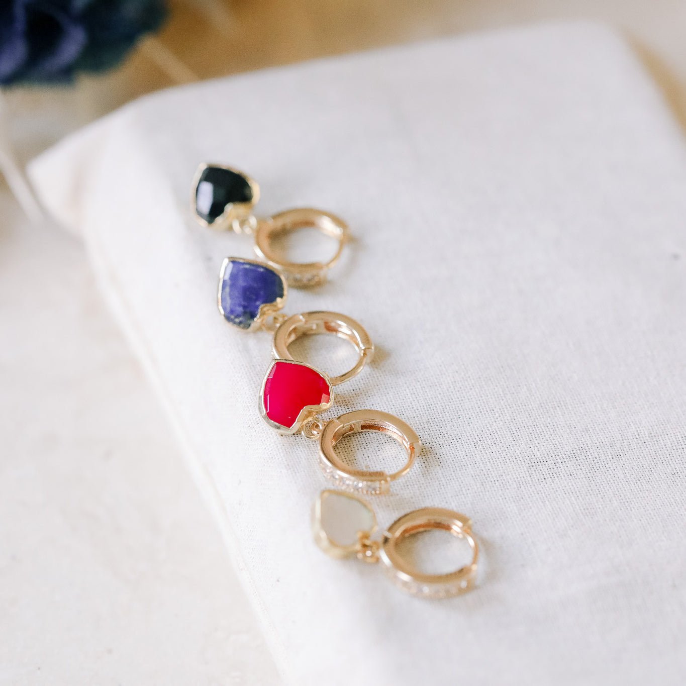 A pair of gemstone heart huggie earrings. The huggies are one touch with clear CZ crystals. Adorable, sweet and sparkling ✨