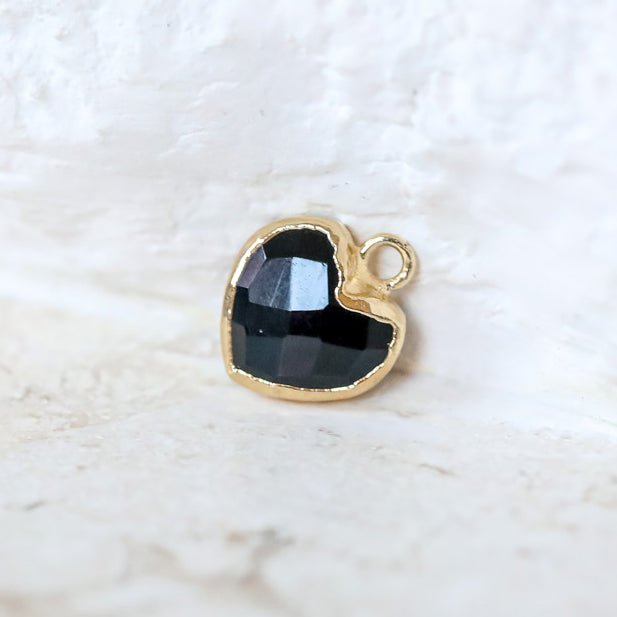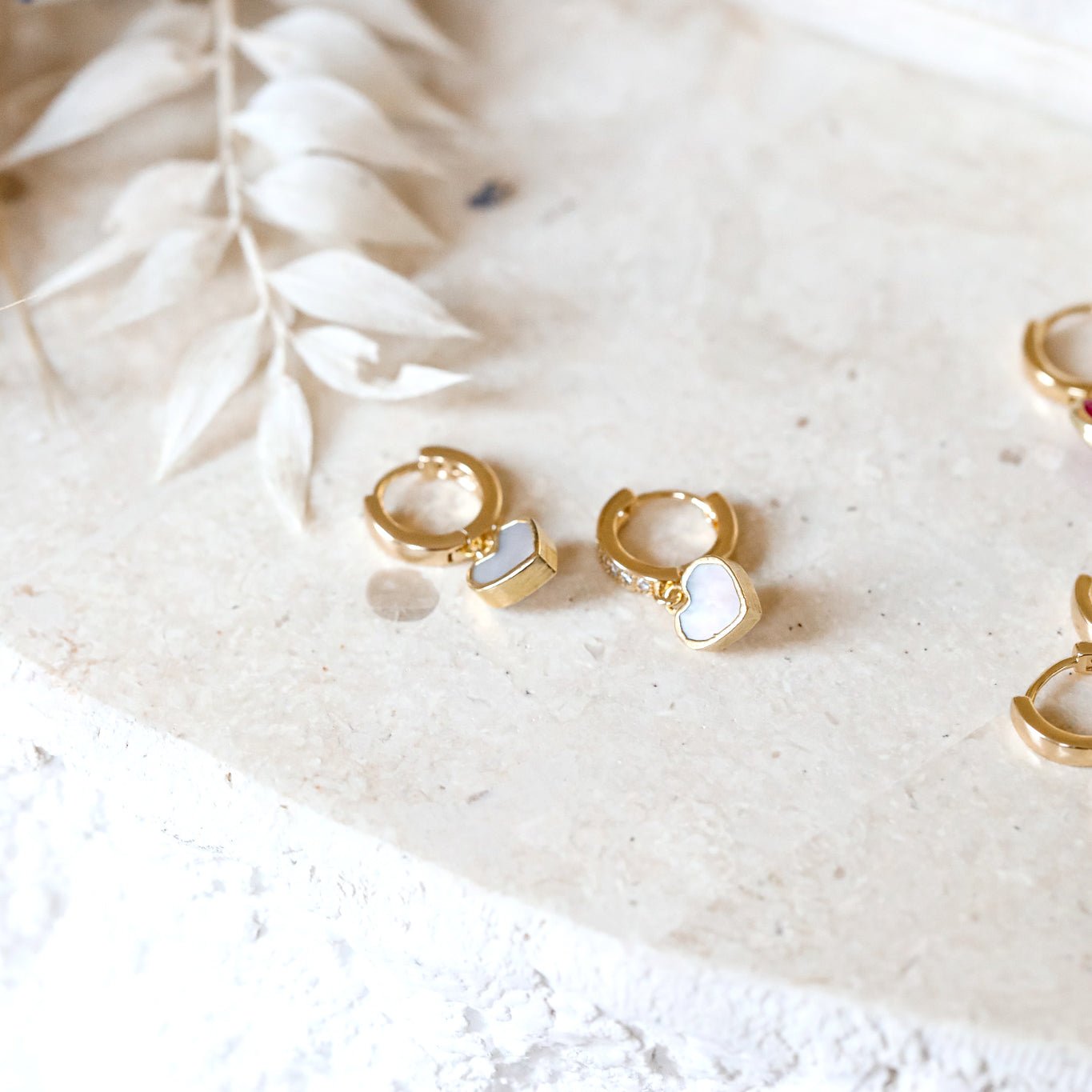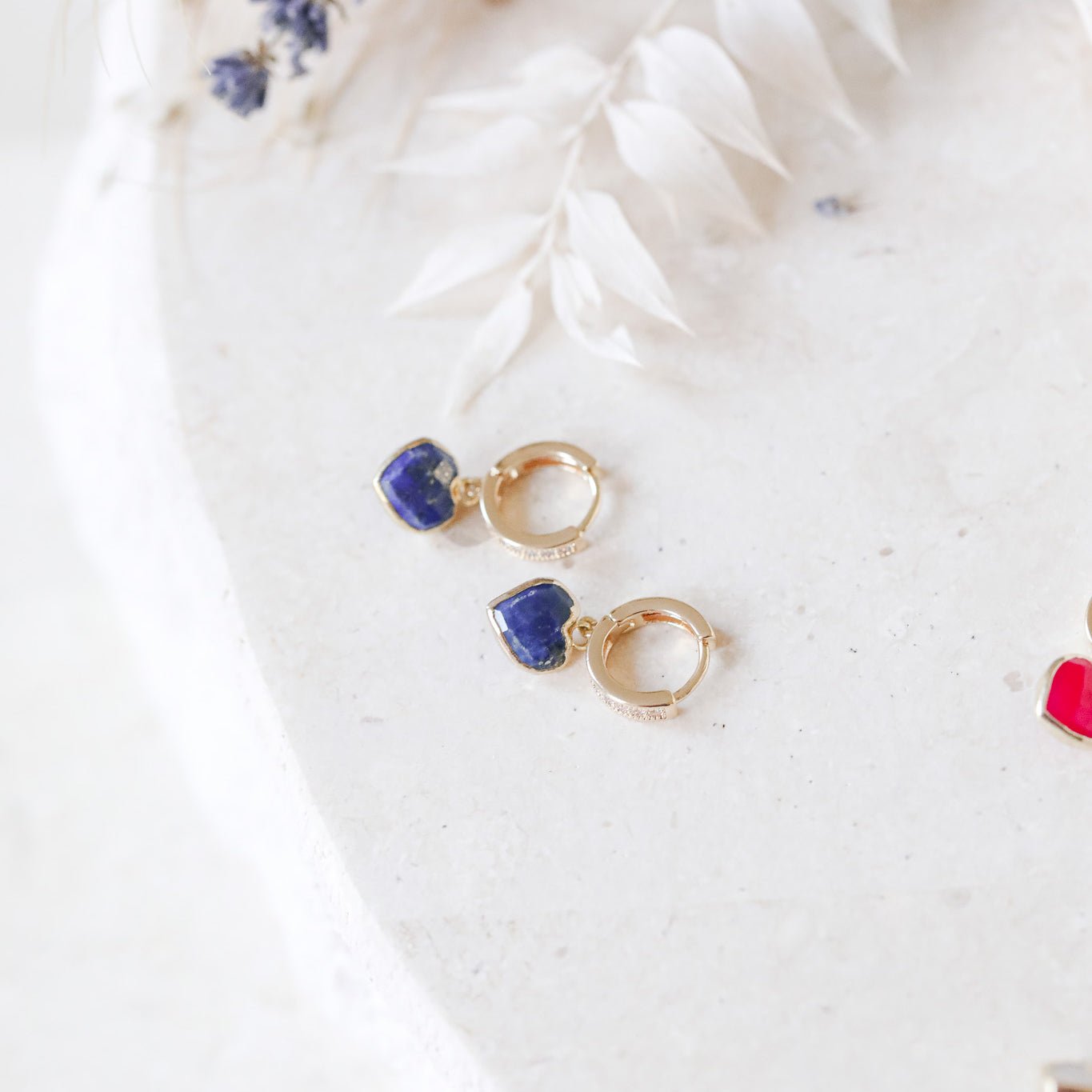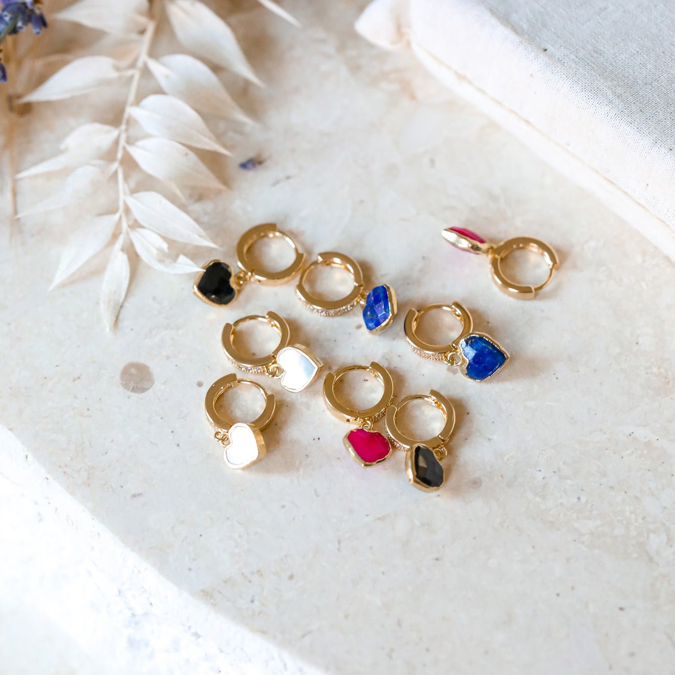 A pair of gemstone heart huggie earrings. The huggies are one touch with clear CZ crystals. Adorable, sweet and sparkling ✨