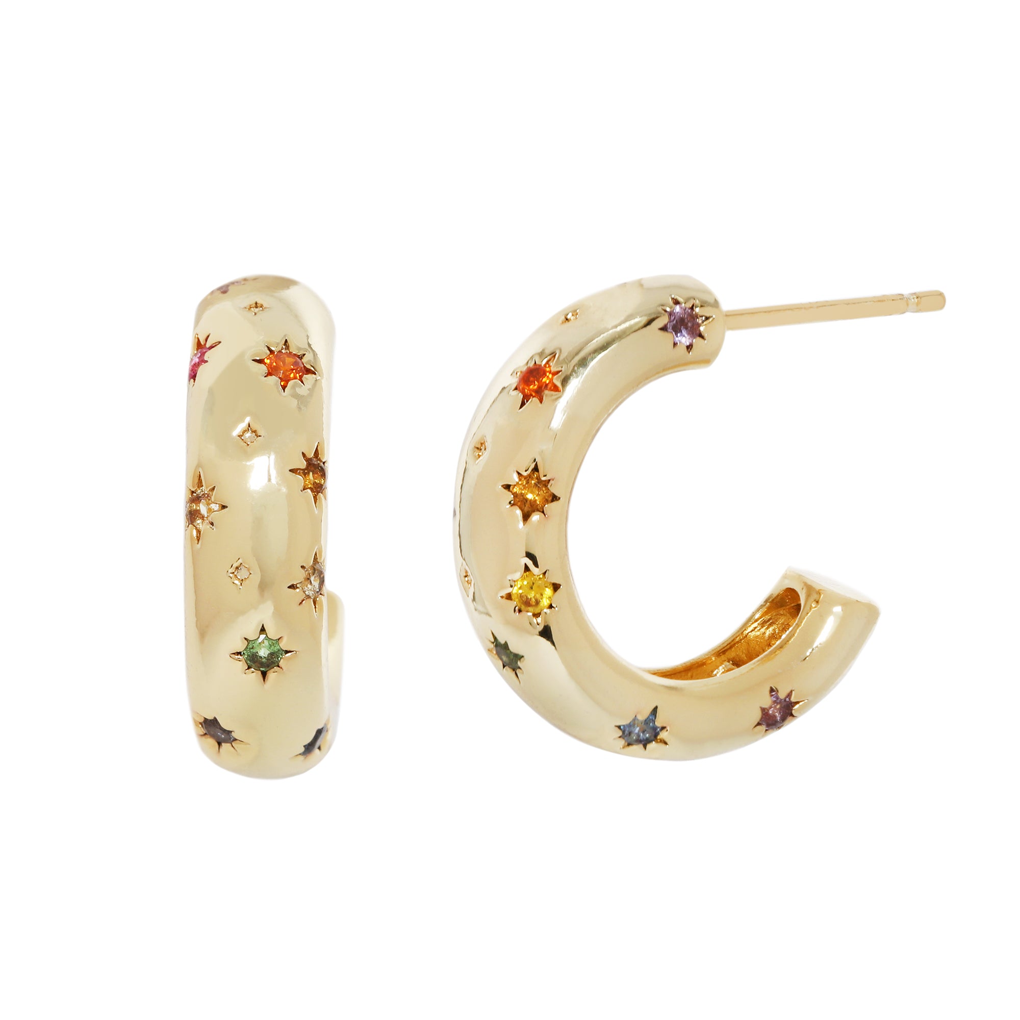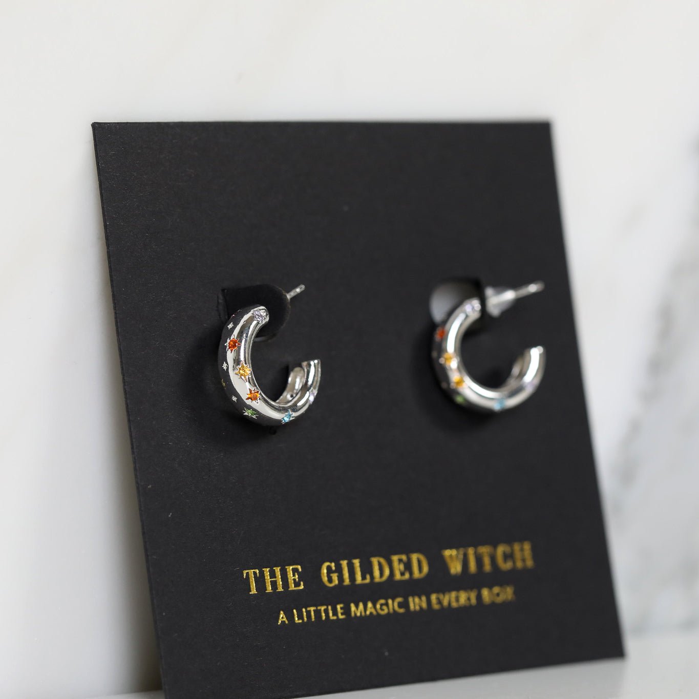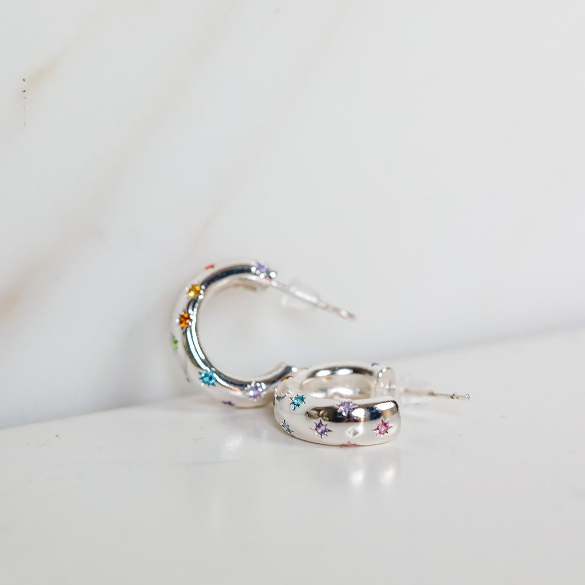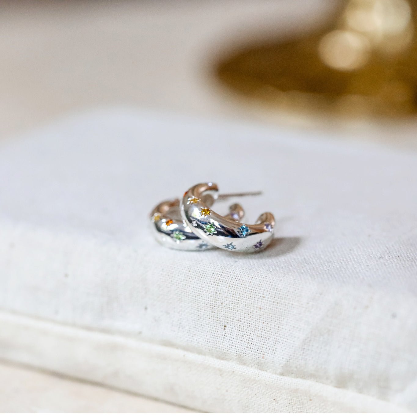 The silver version of our best-selling Stella hoops! A silver plated hoop with multi-colored stars embedded throughout. The perfect size, perfect color, perfect weight.