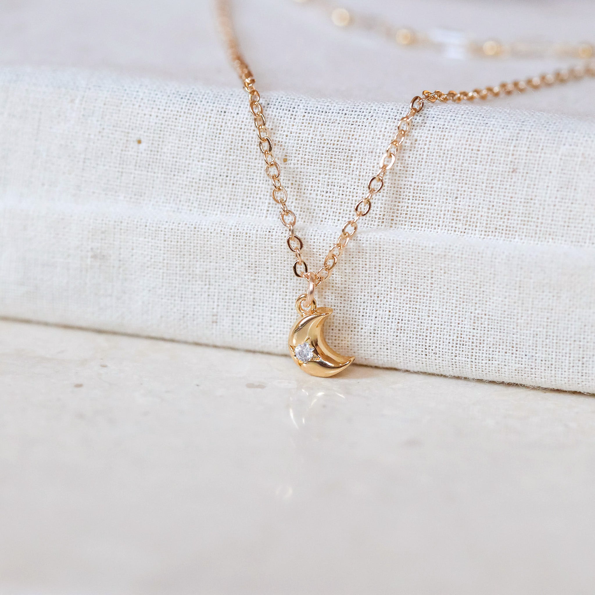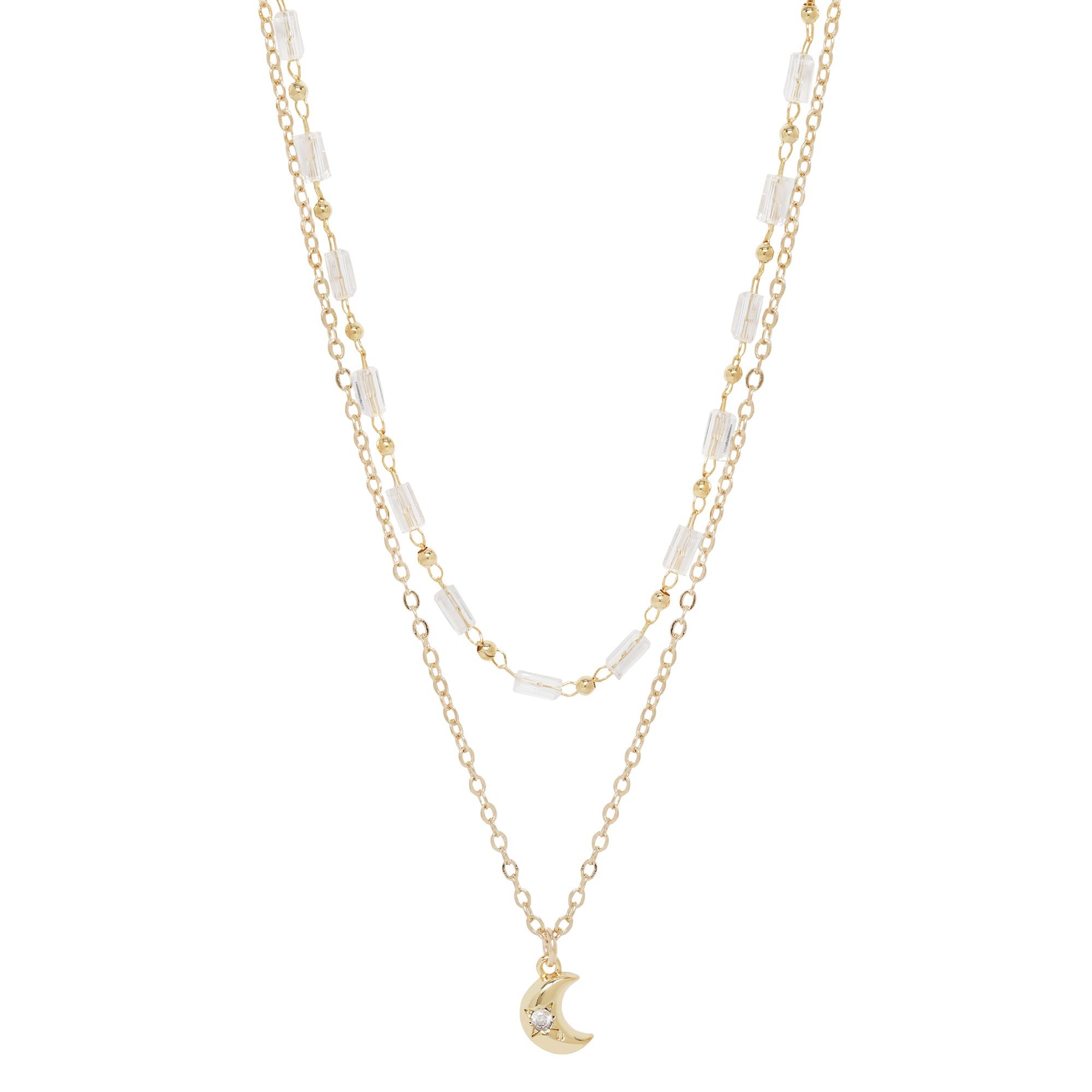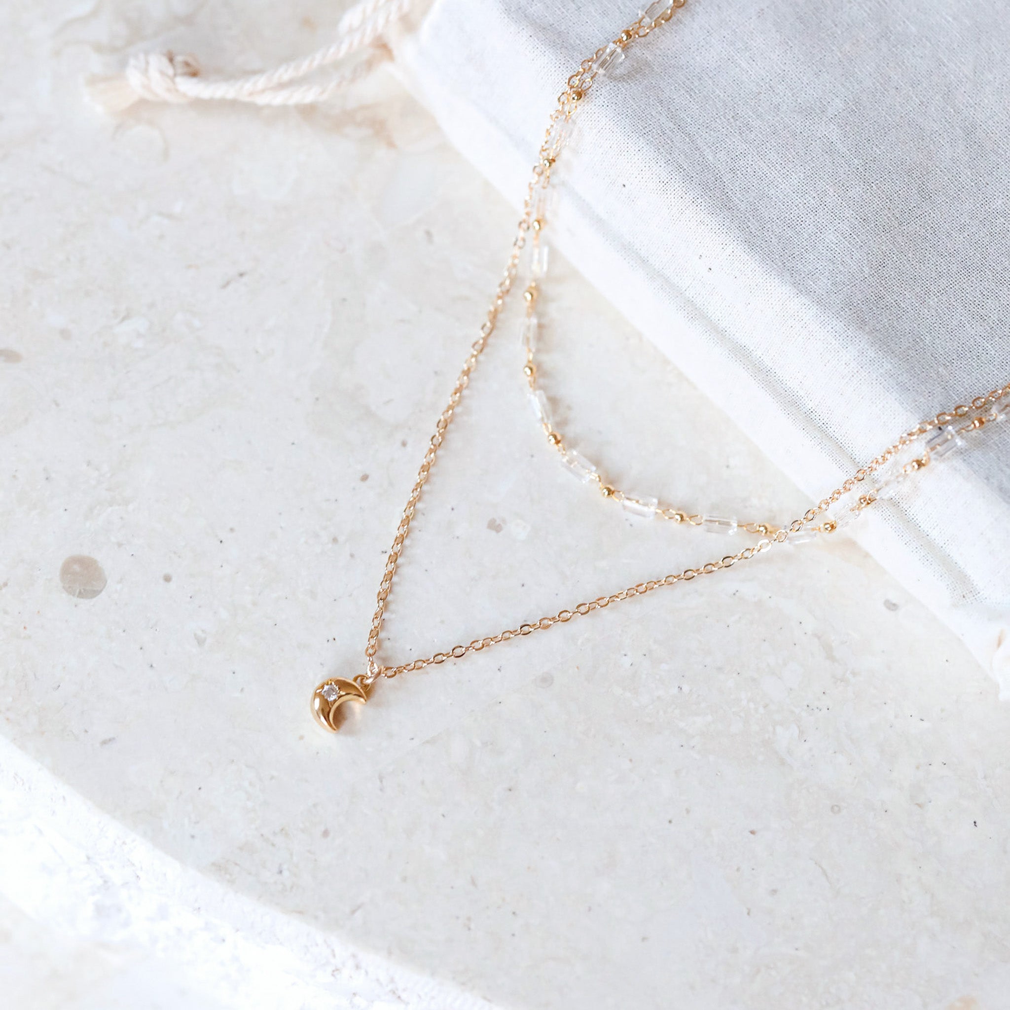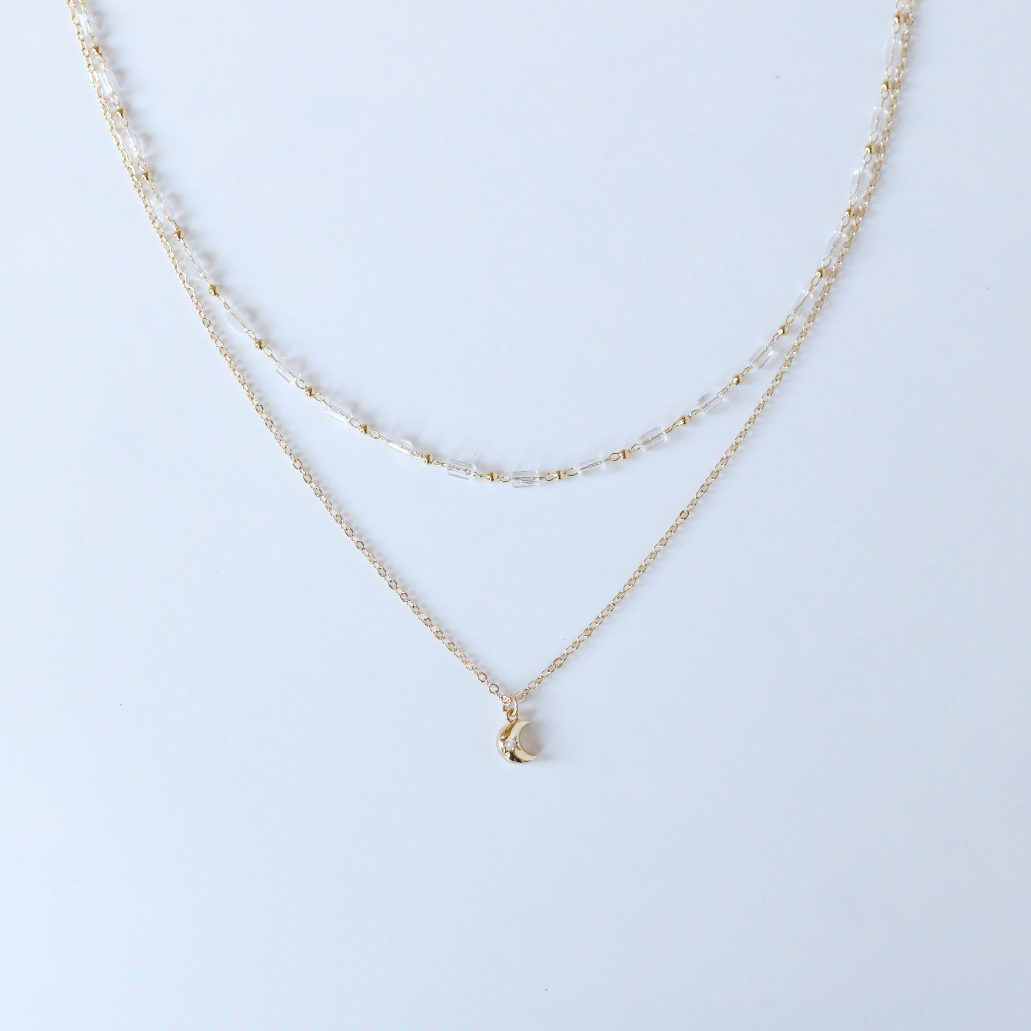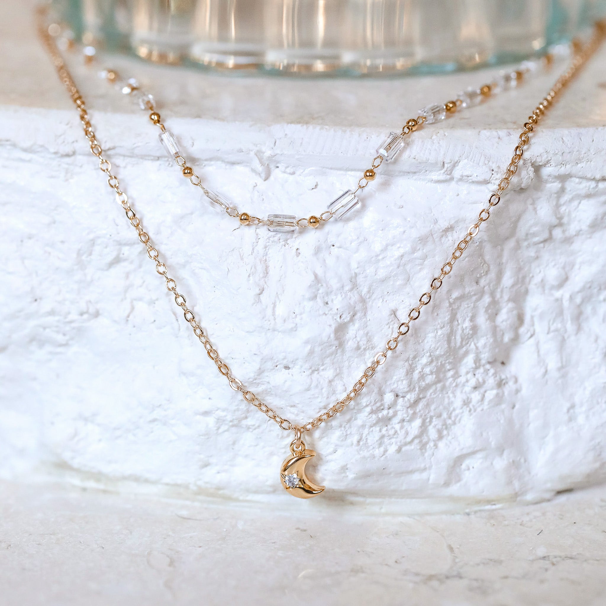 A double strand necklace with rock crystal chain on the top and a gold filled star or moon charm necklace below.