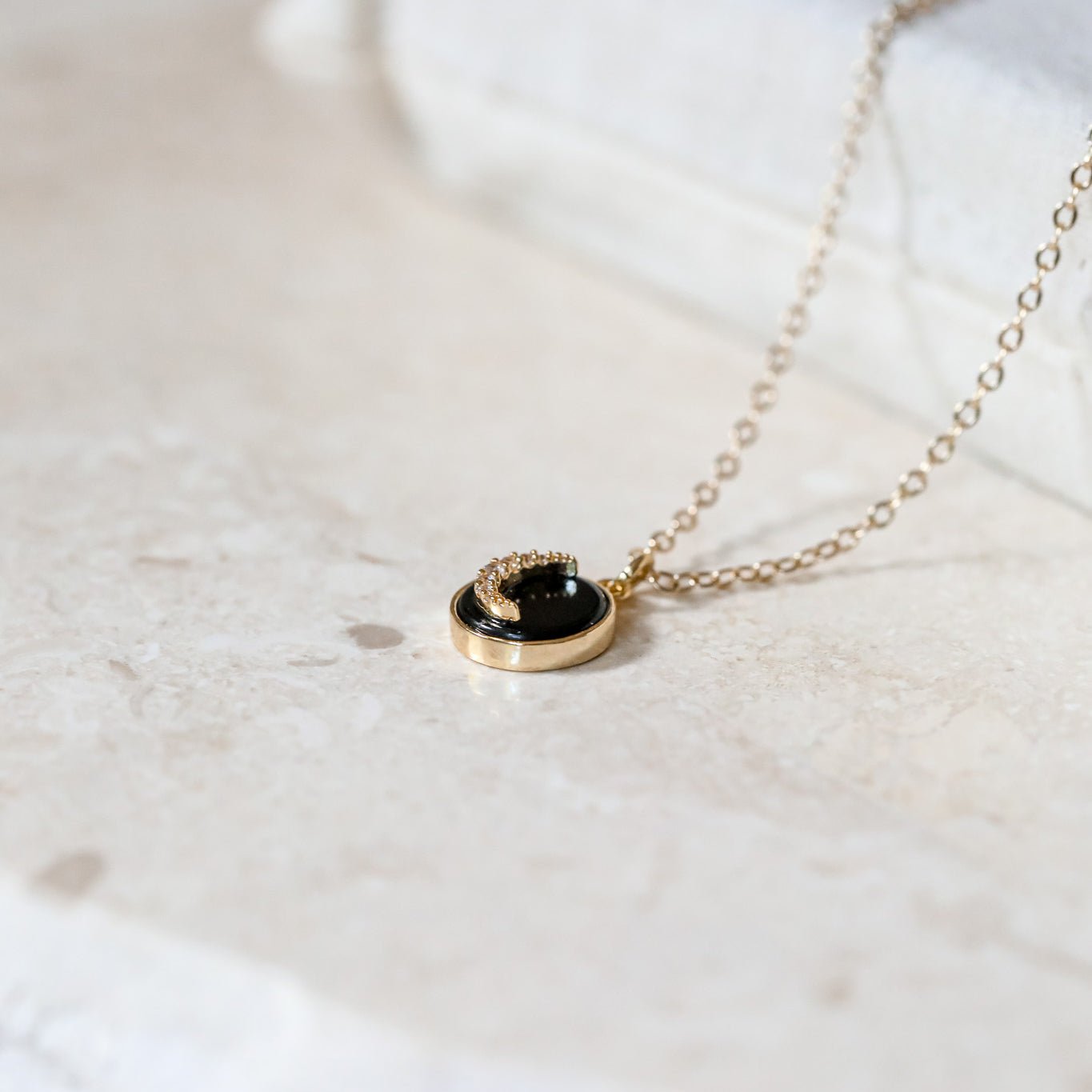 A beautiful black glass crescent moon charm necklace. The sparkling crescent moon shines bright against the smooth black glass. Hangs from 14kt gold filled chain.