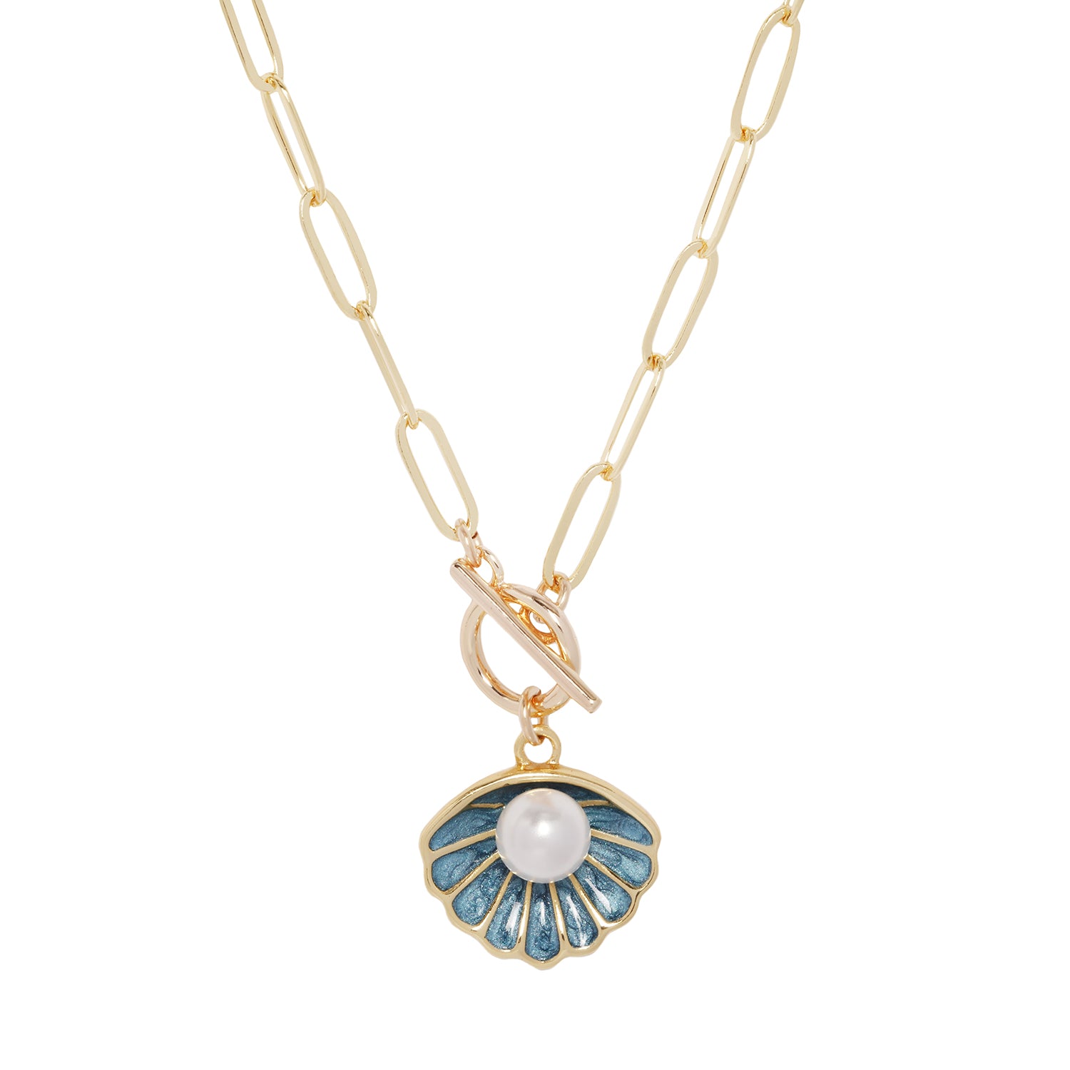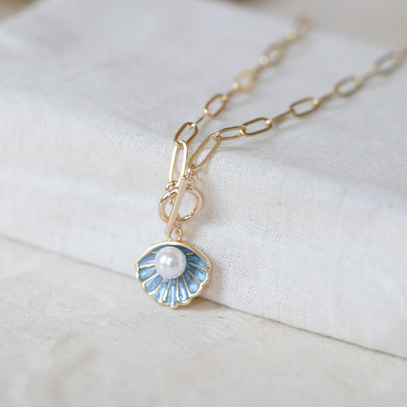 A blue shell and pearl toggle necklace with 14kt gold filled paperclip chain.