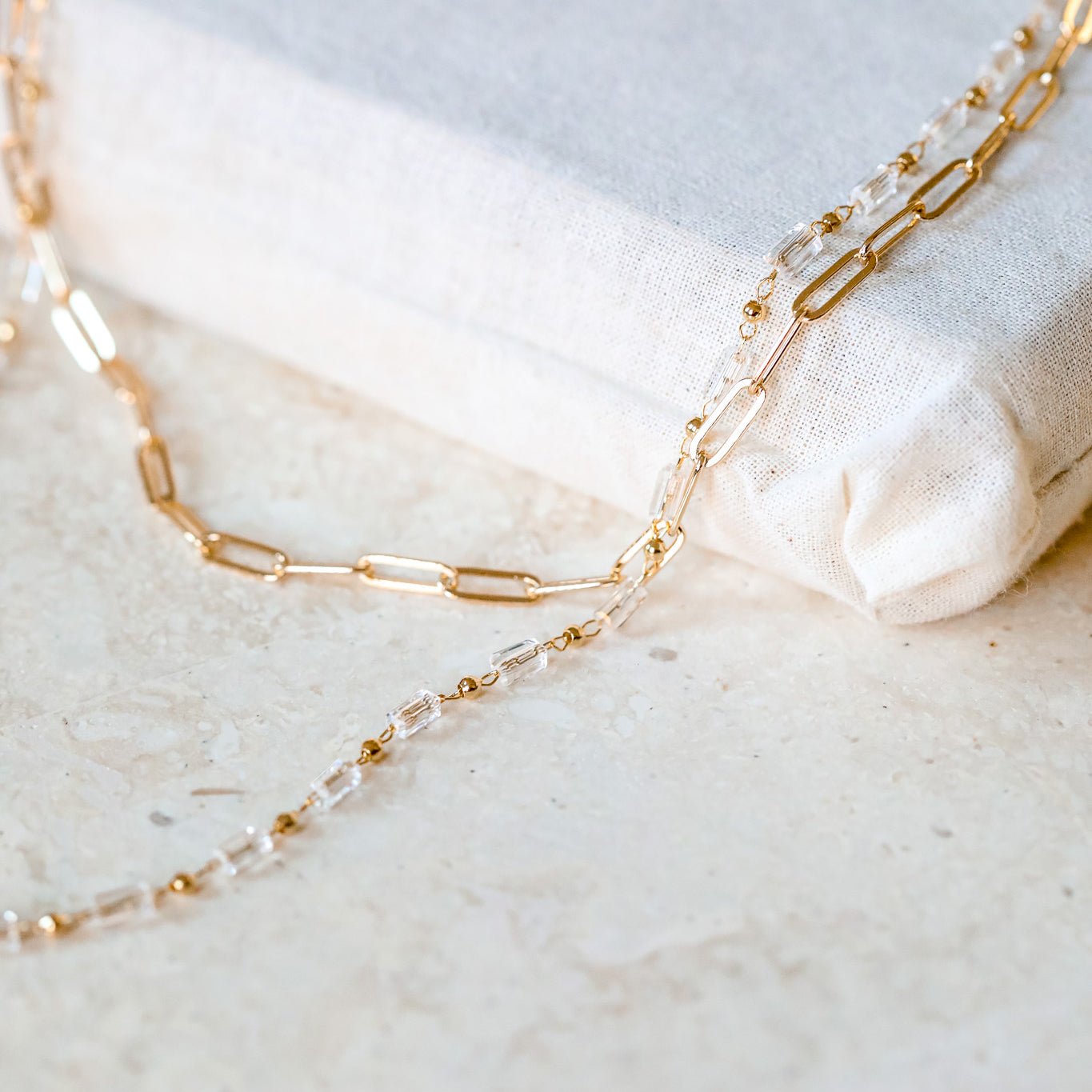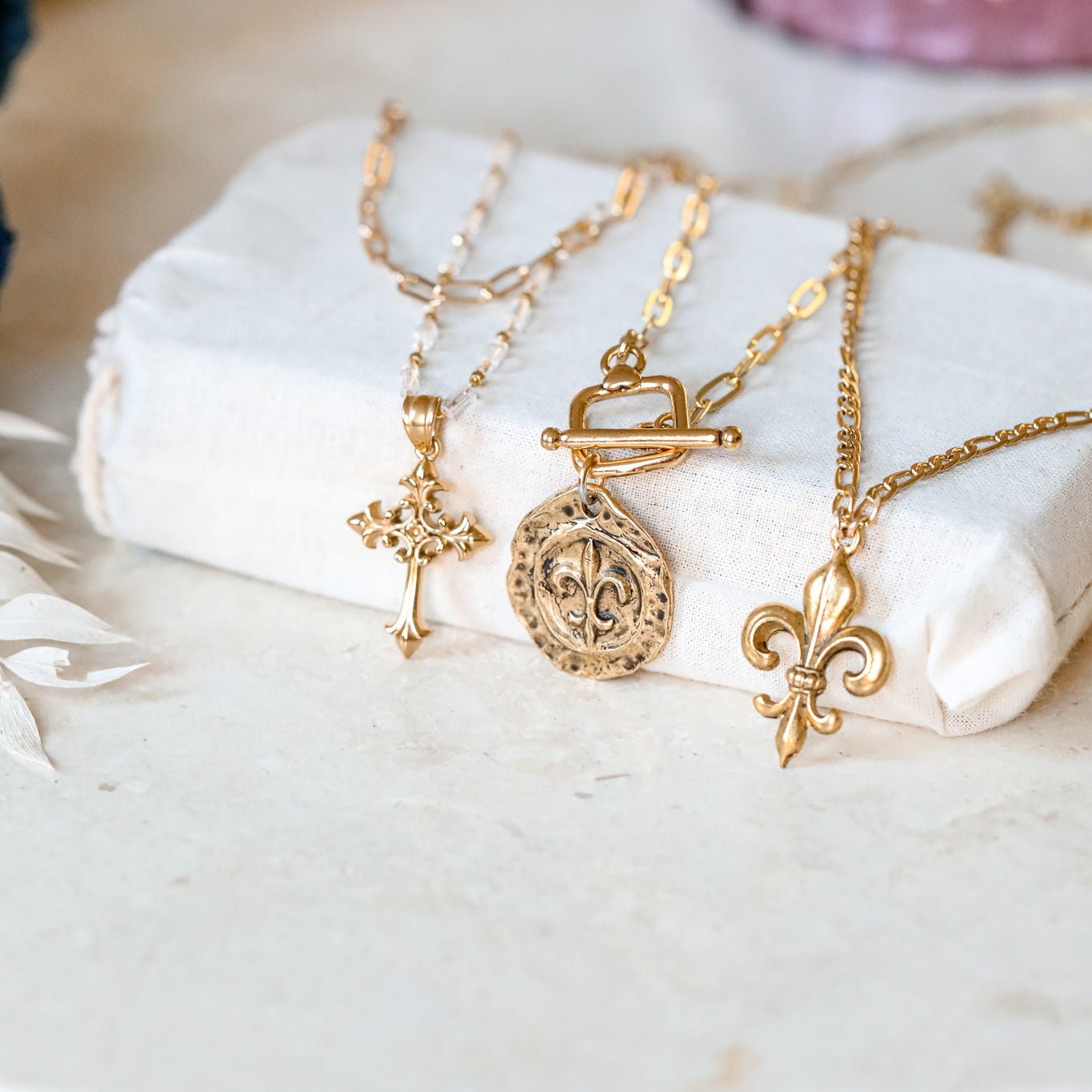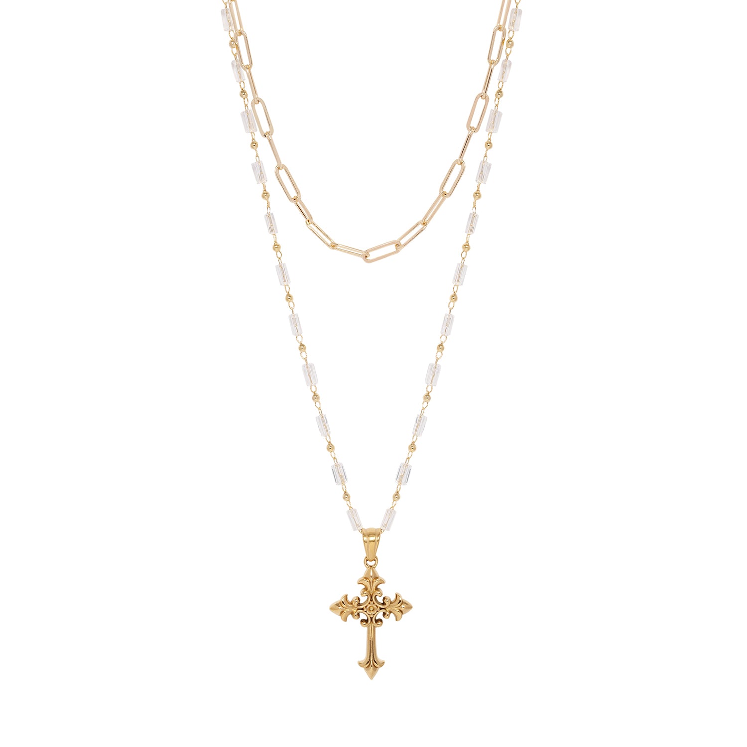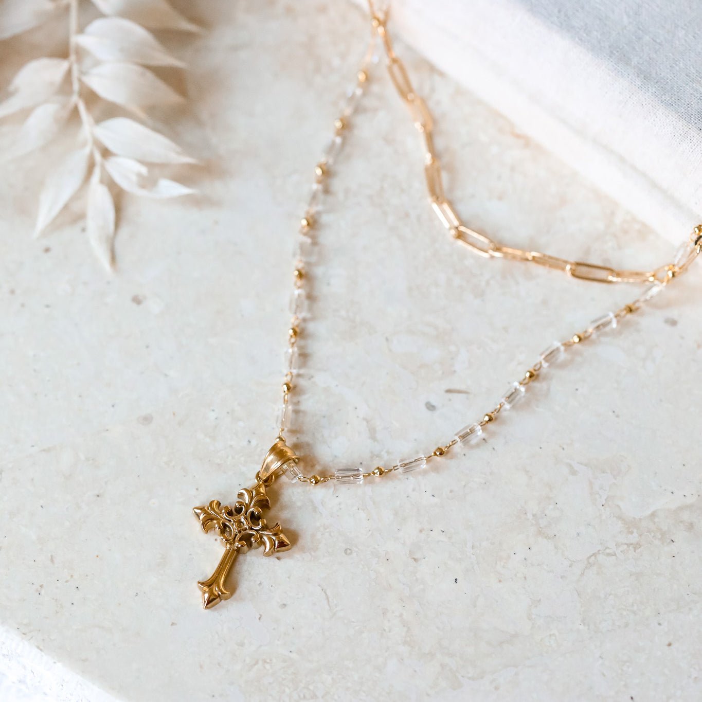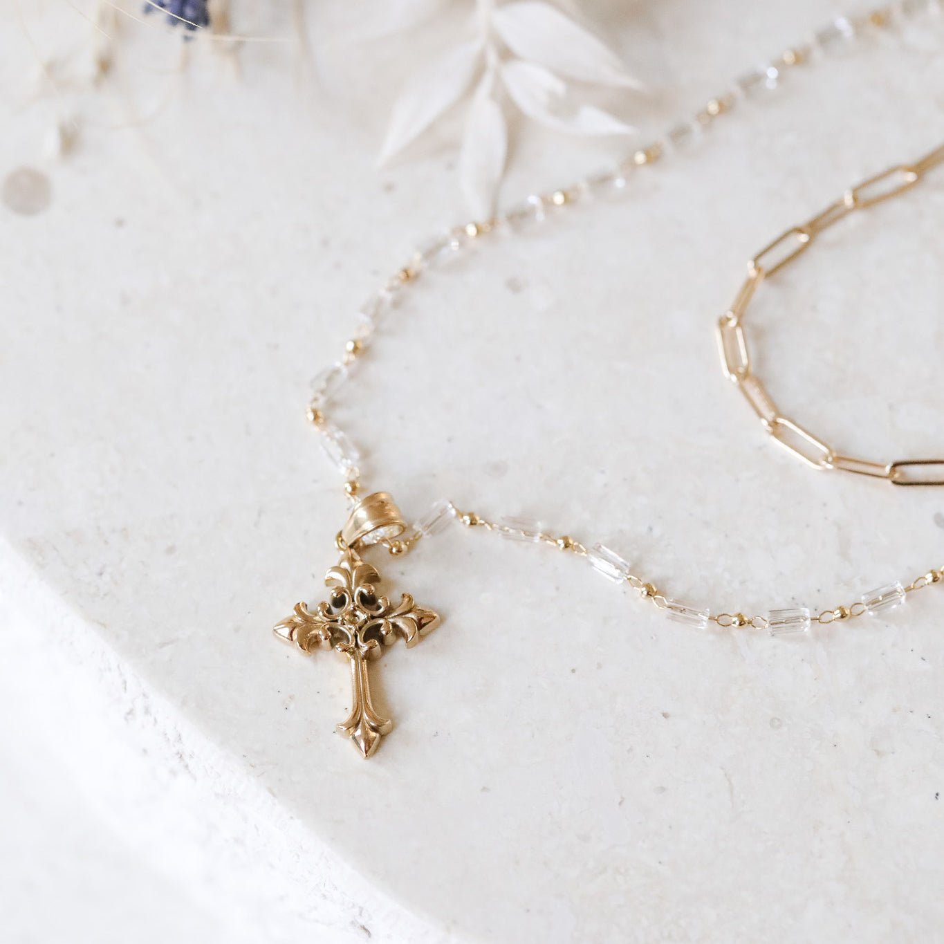 "Antique Cross" necklace. A double chain necklace with rock crystal and gold filled paperclip chain, plus a large antique style cross charm. A french gothic beauty.