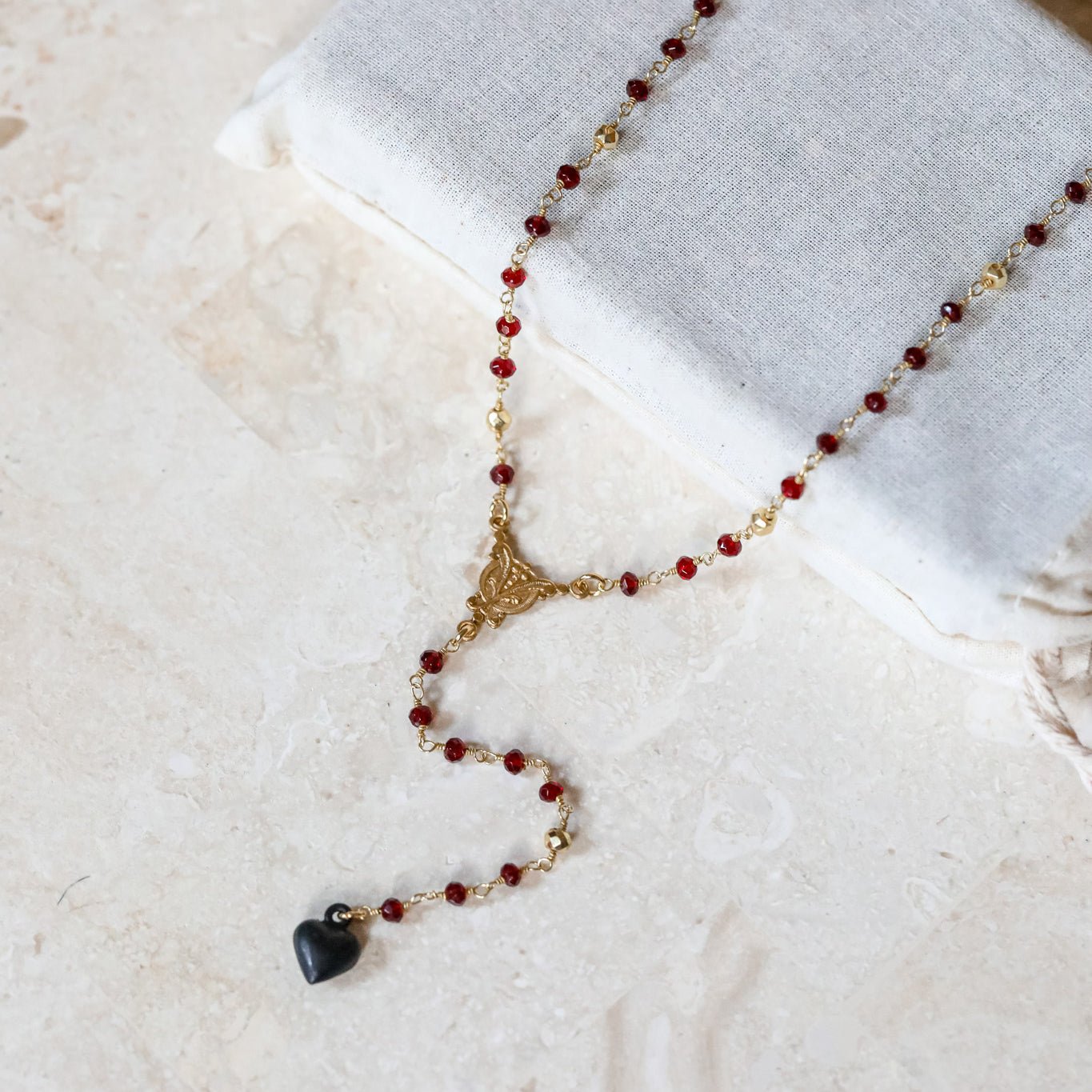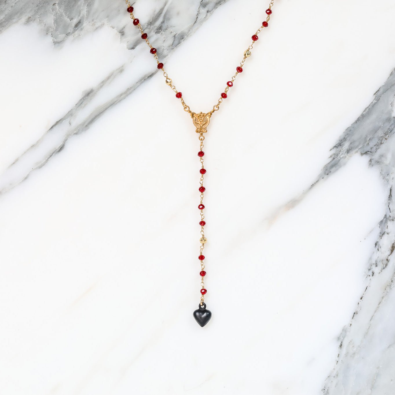 A lariat necklace made with black spinel or red glass rosary beads pair with a delicate, handcrafted black patina'd heart charm.