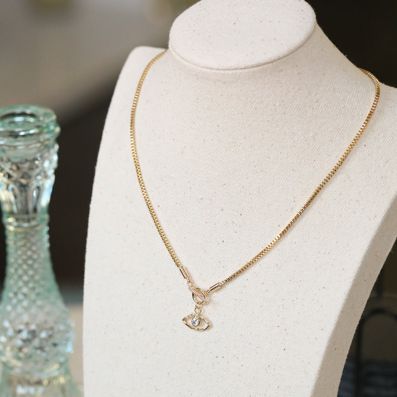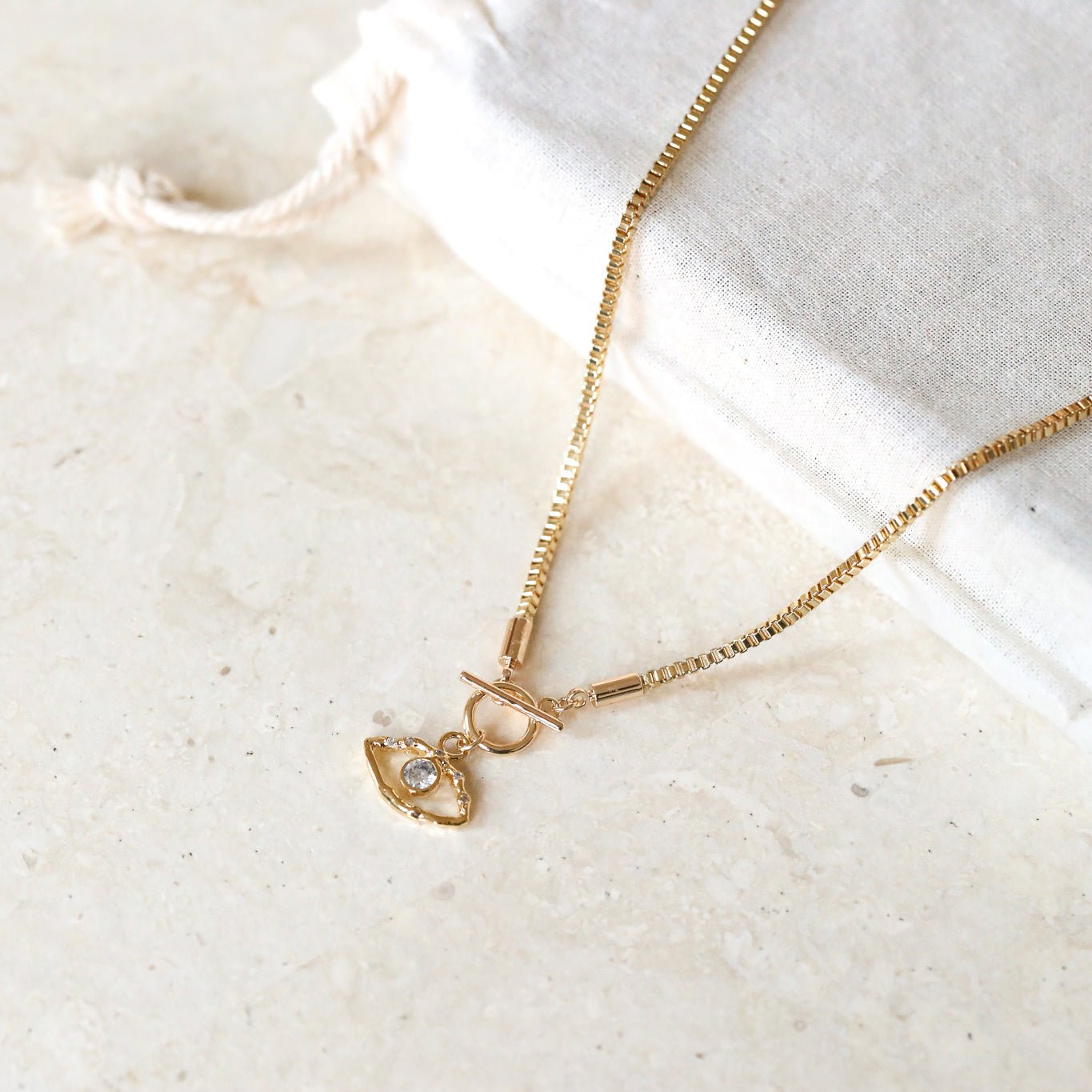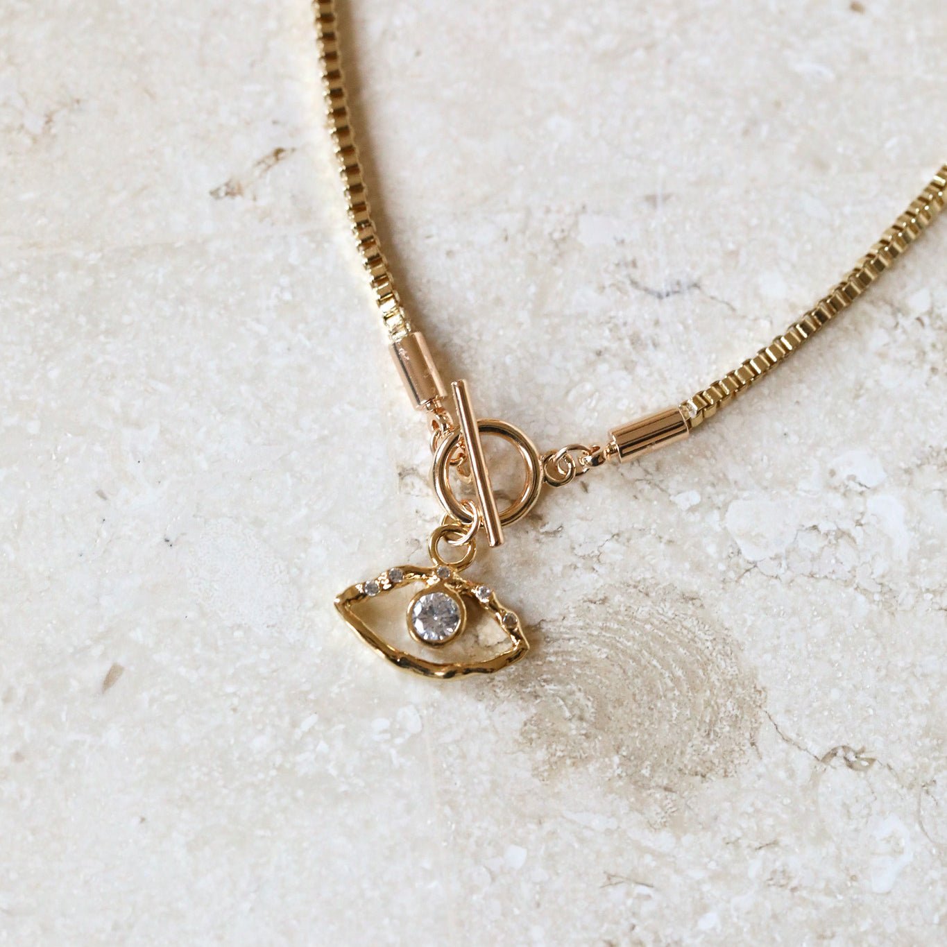 An evil eye charm toggle necklace with gold box chain. A gorgeously bright, protective necklace with shine and shimmer.
