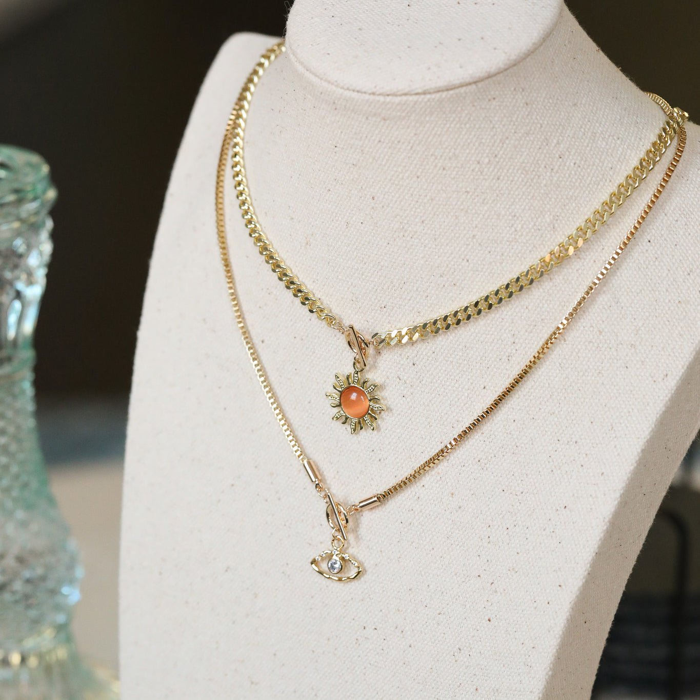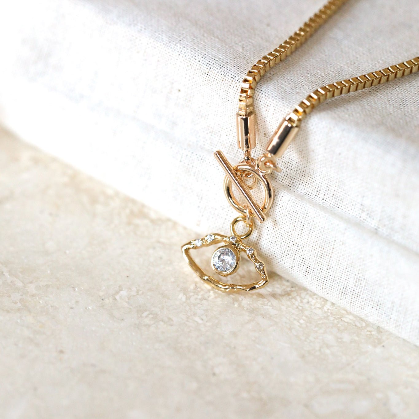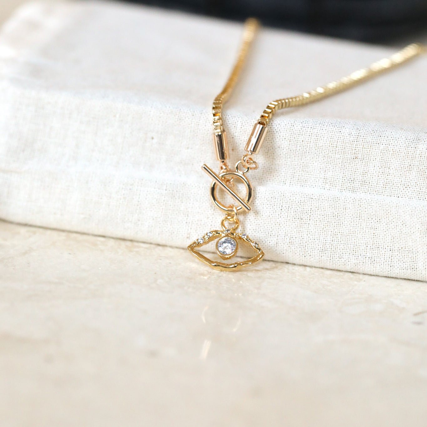 An evil eye charm toggle necklace with gold box chain. A gorgeously bright, protective necklace with shine and shimmer.