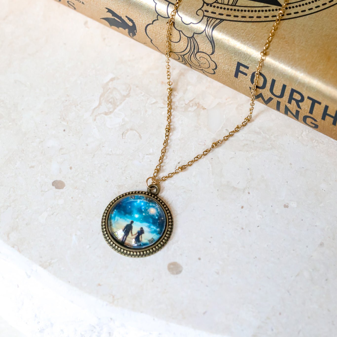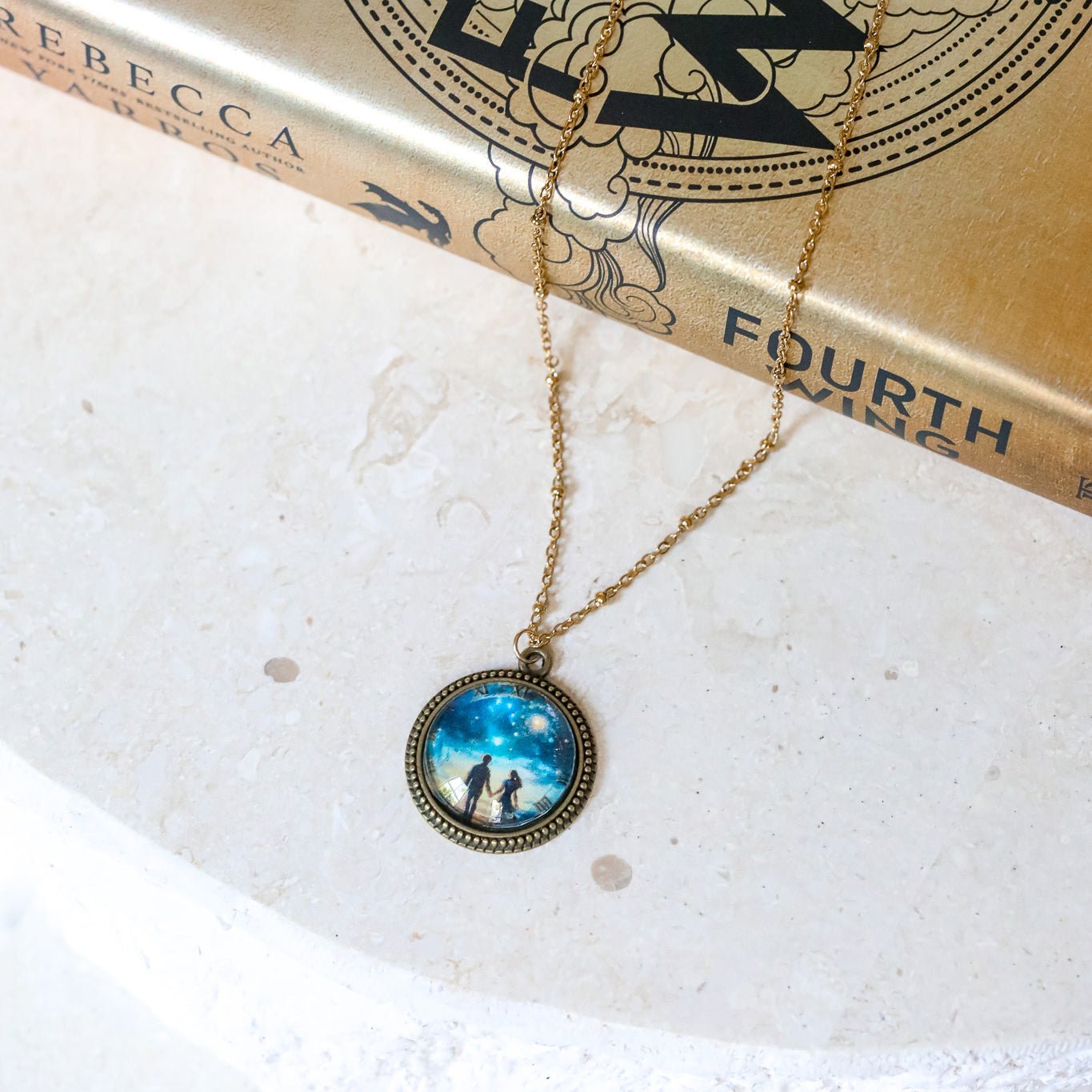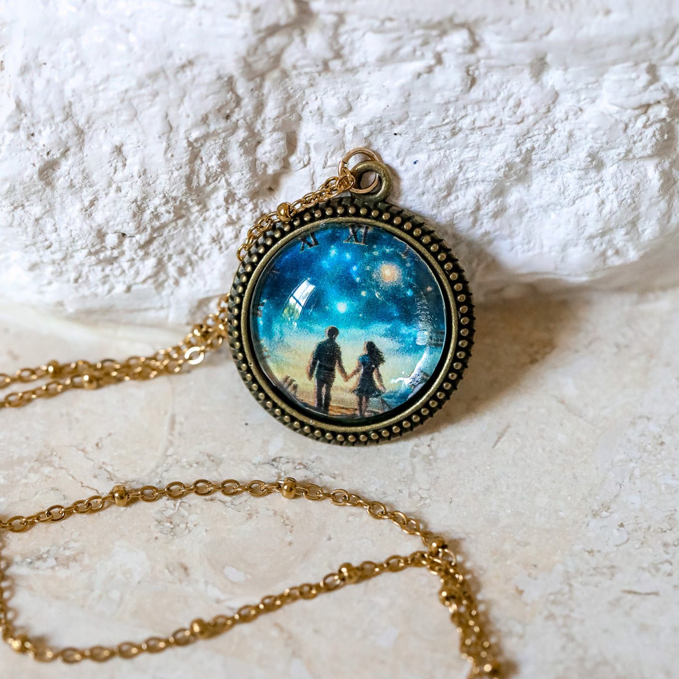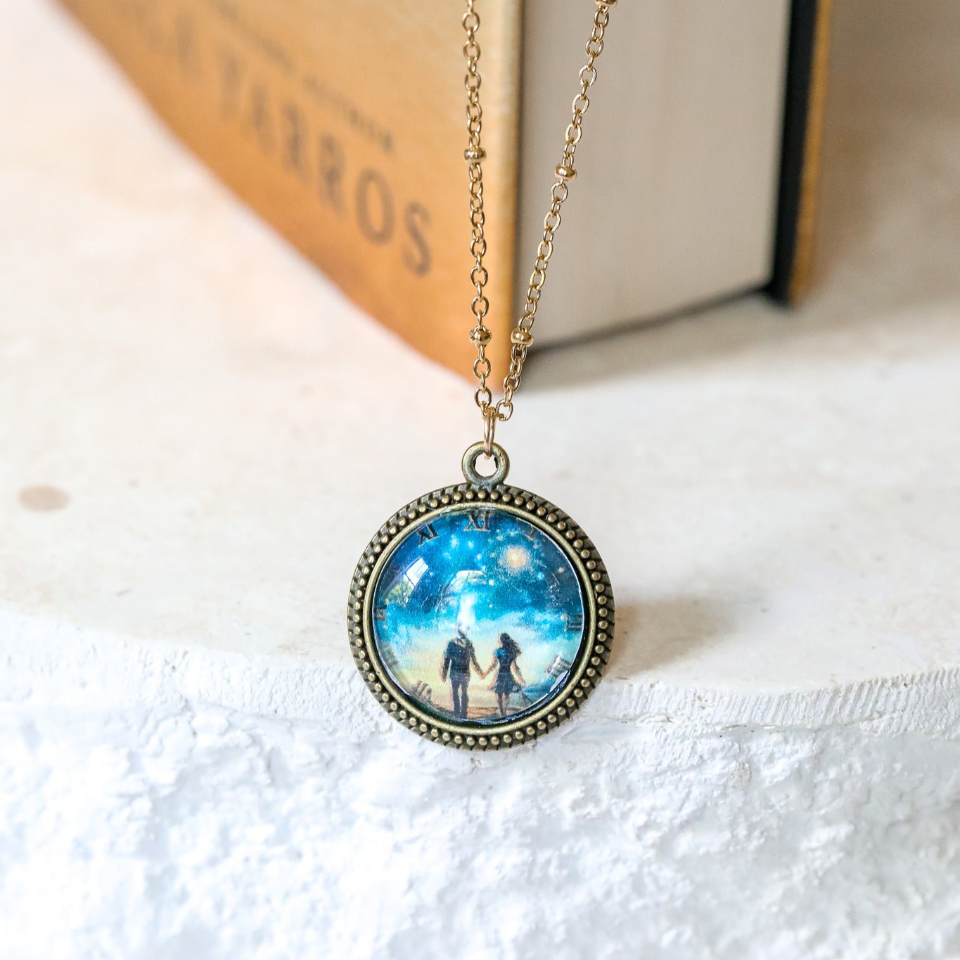 Anyone else obsessed with Romantasy? 🌹 This necklace was inspired by one of the most beloved Tropes: Fated Mates. A custom cameo of a couple, surrounded by the hands of a clock. Hangs from a stainless steel satellite chain.