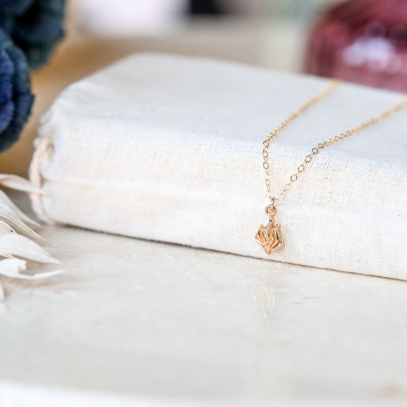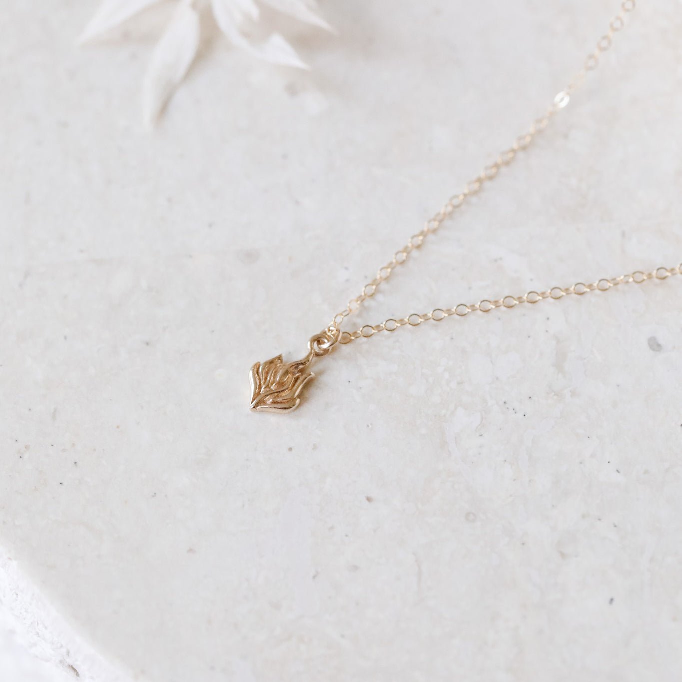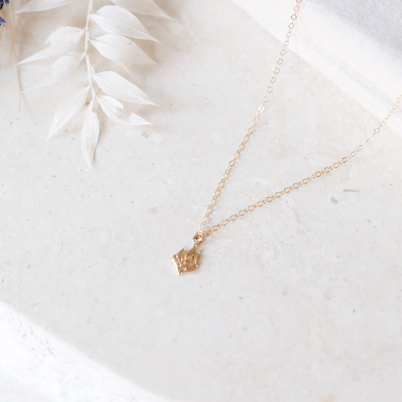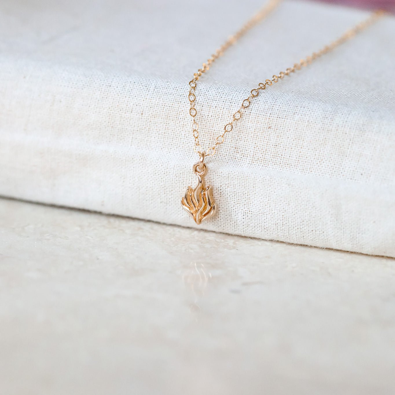A tiny bronze flame charm hangs from gold filled chain. Thin, delicate and powerful.