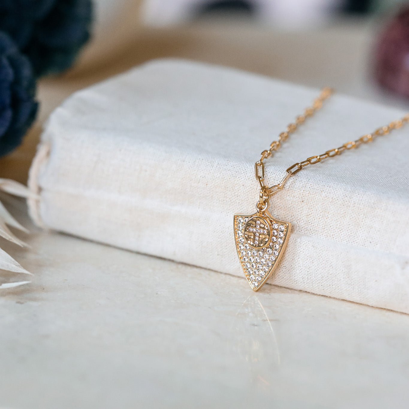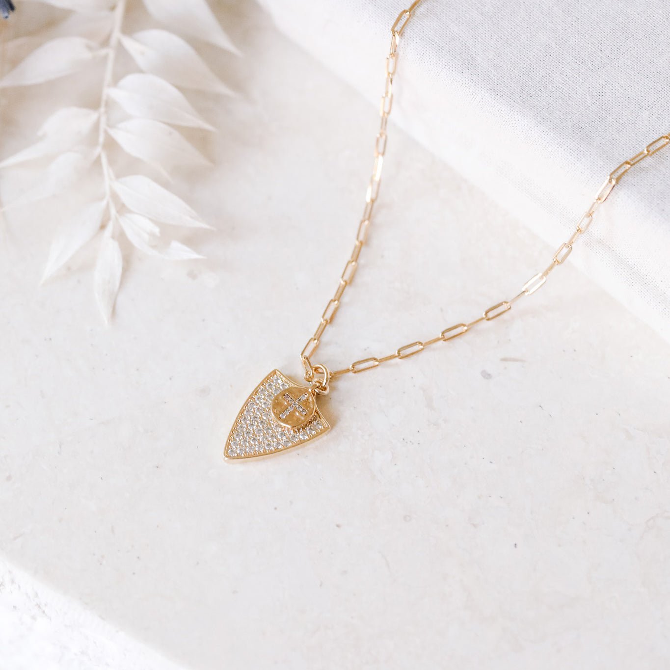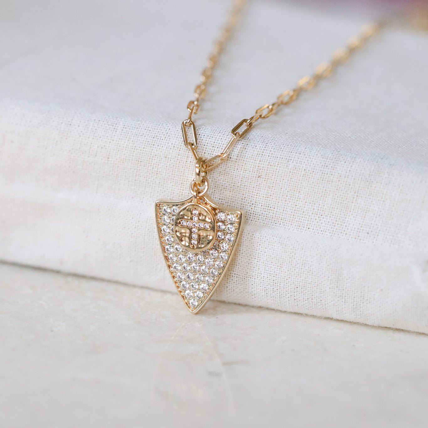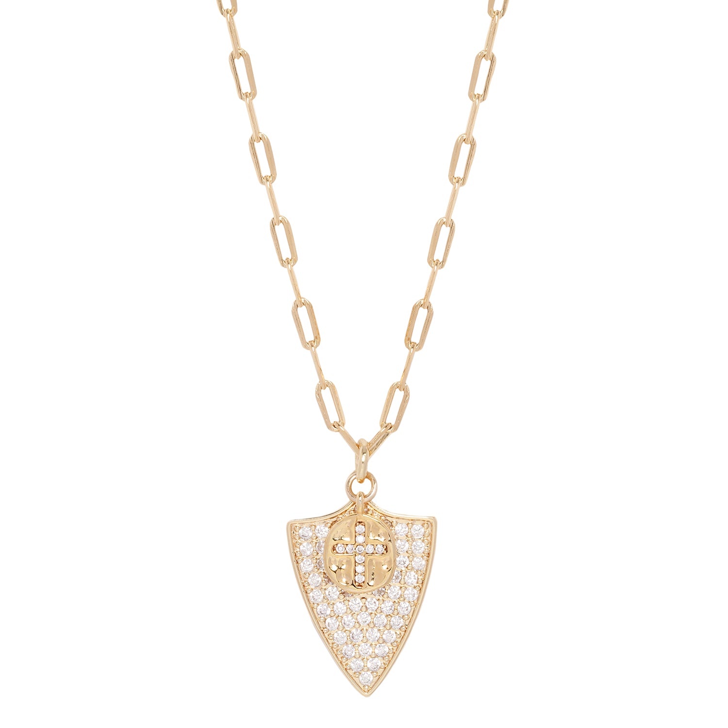 "Jeanne d'Arc" necklace. A CZ-encrusted sheild charm and tiny cross charm hang from thick paperclip chain. A necklace fit for a warrior.