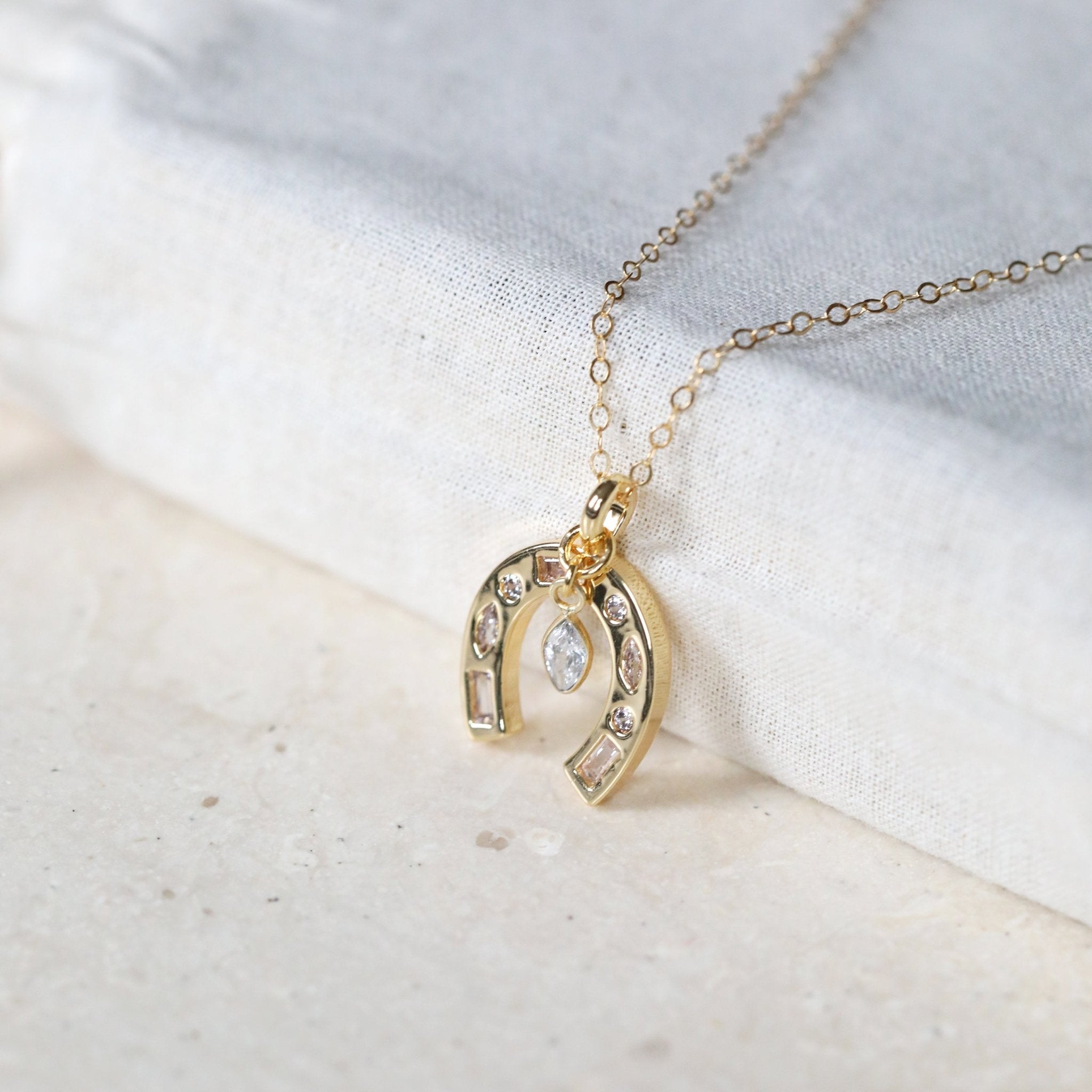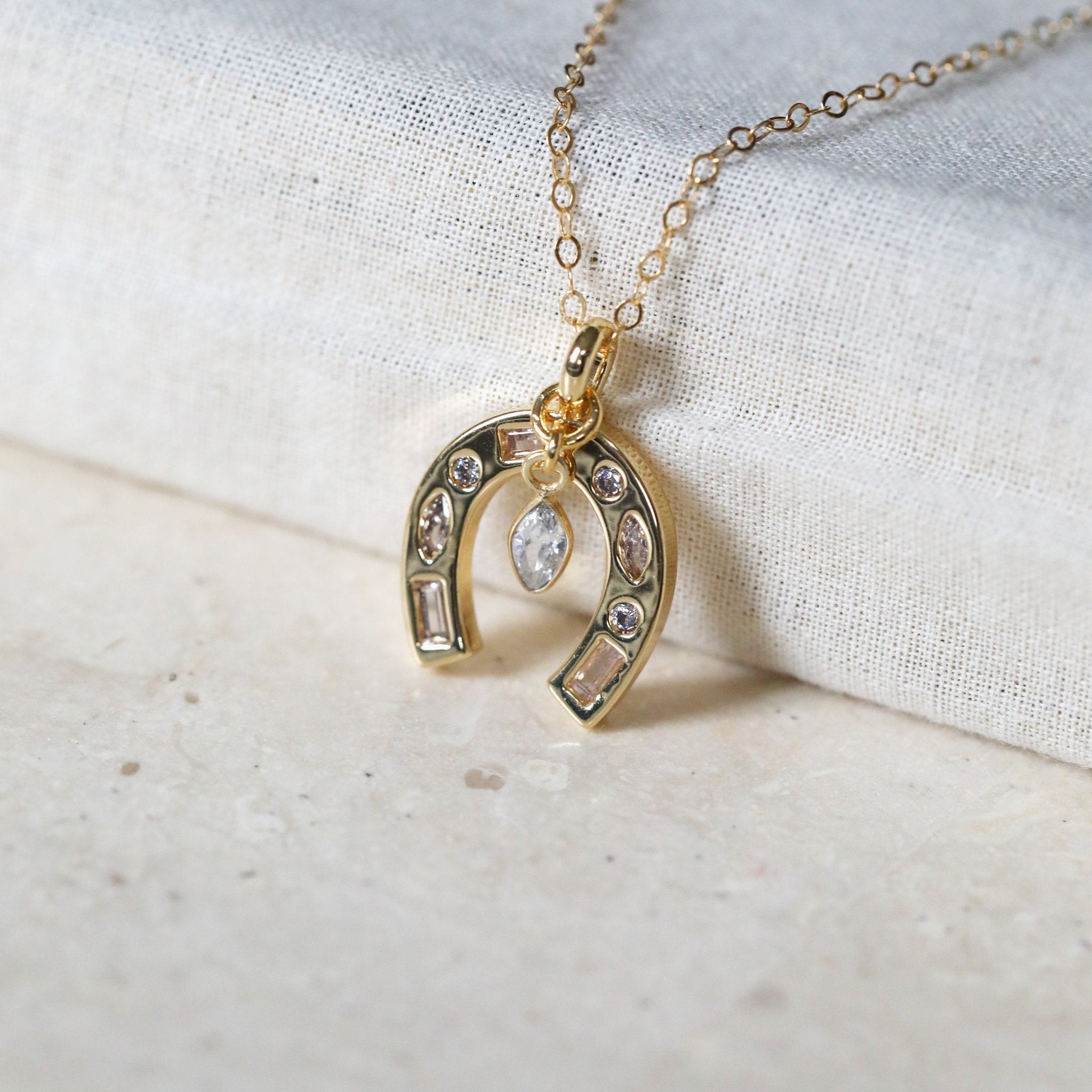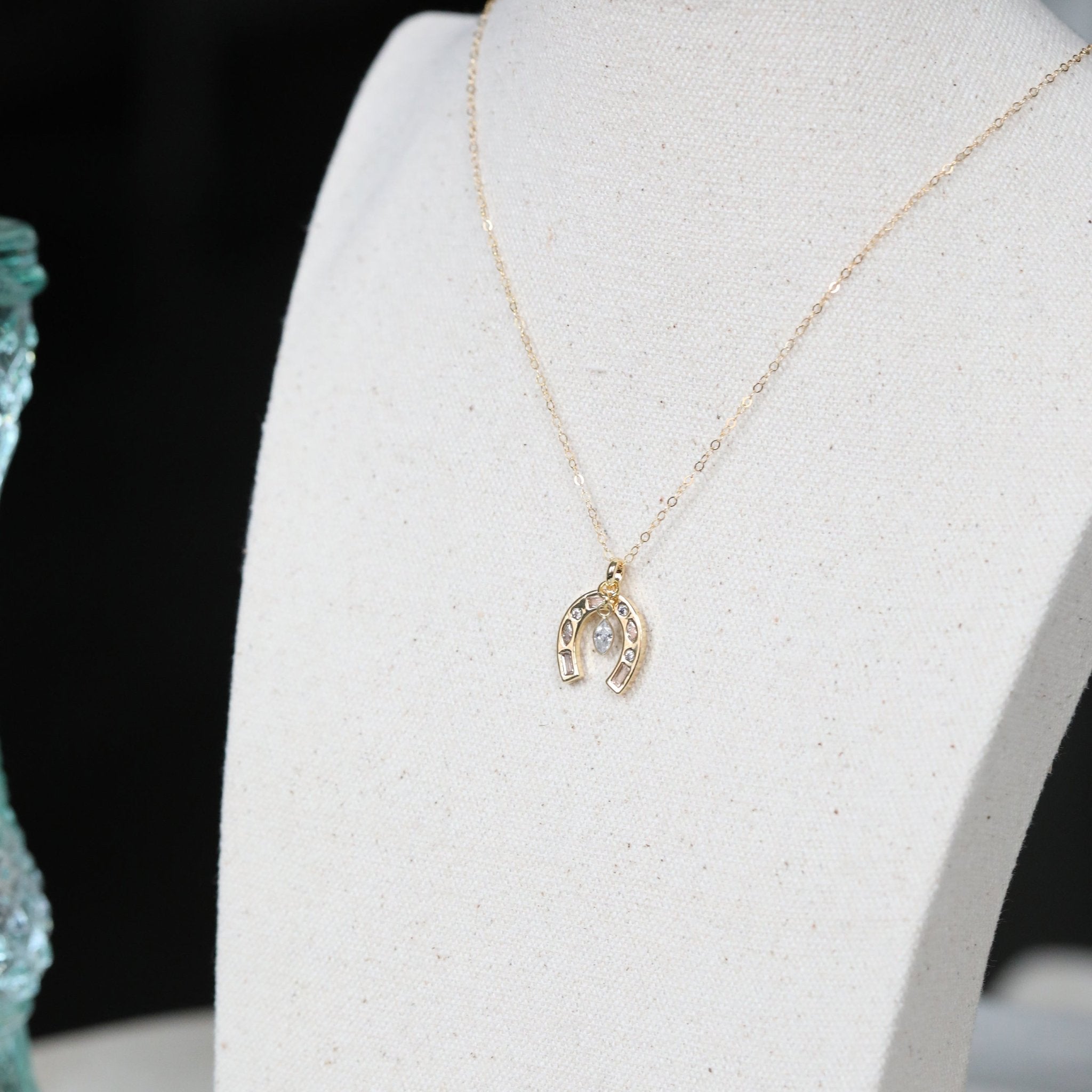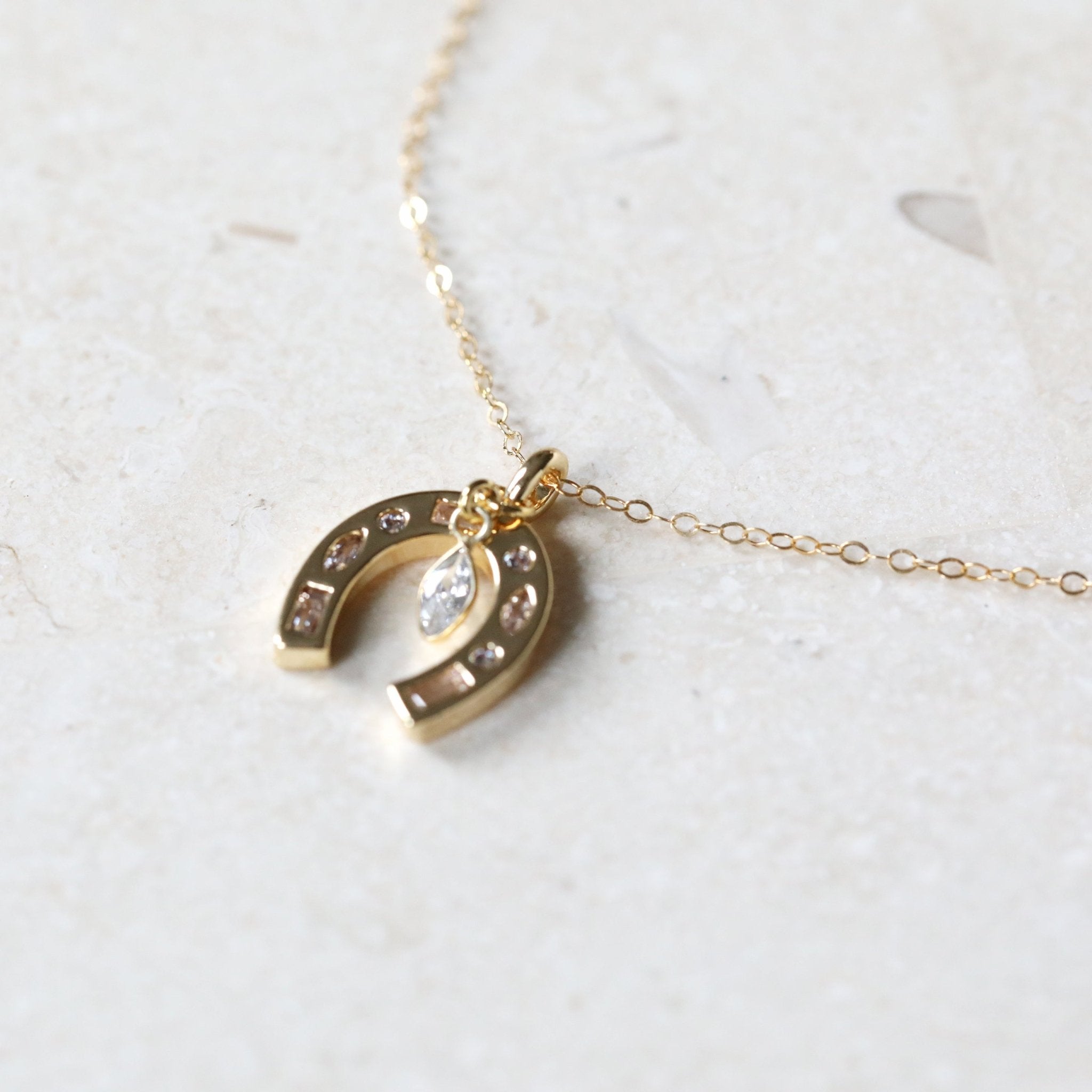A gold and crystal horseshoe charm on a 14kt gold filled chain necklace.