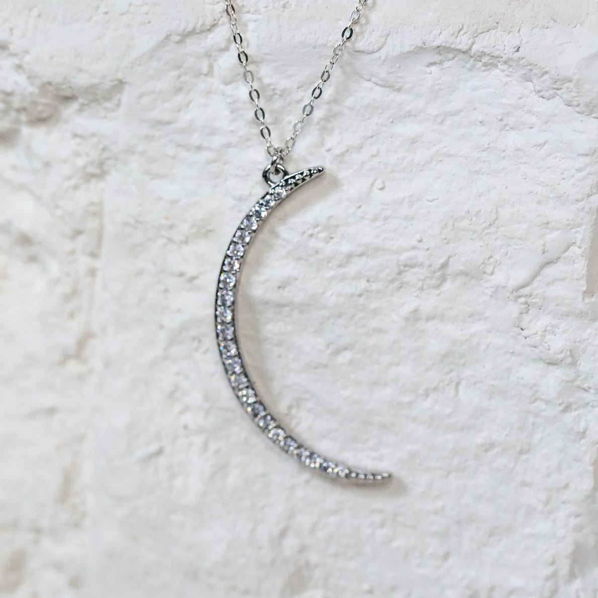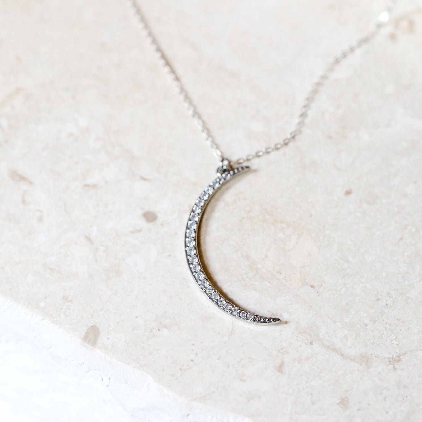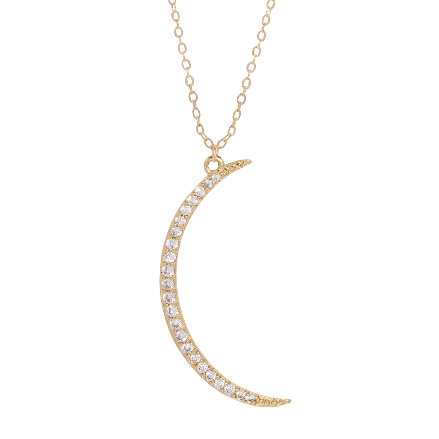 "Crystal Moon" necklace. A large, gorgeously sparkling CZ-encrusted crescent moon necklace in Gold or Silver.