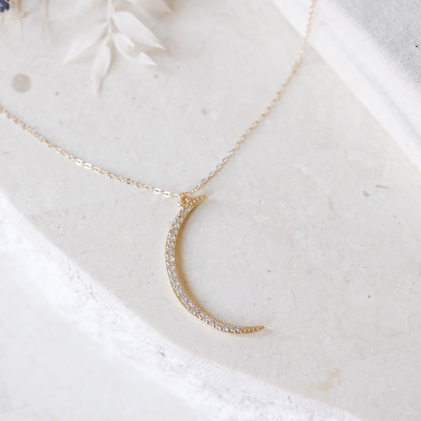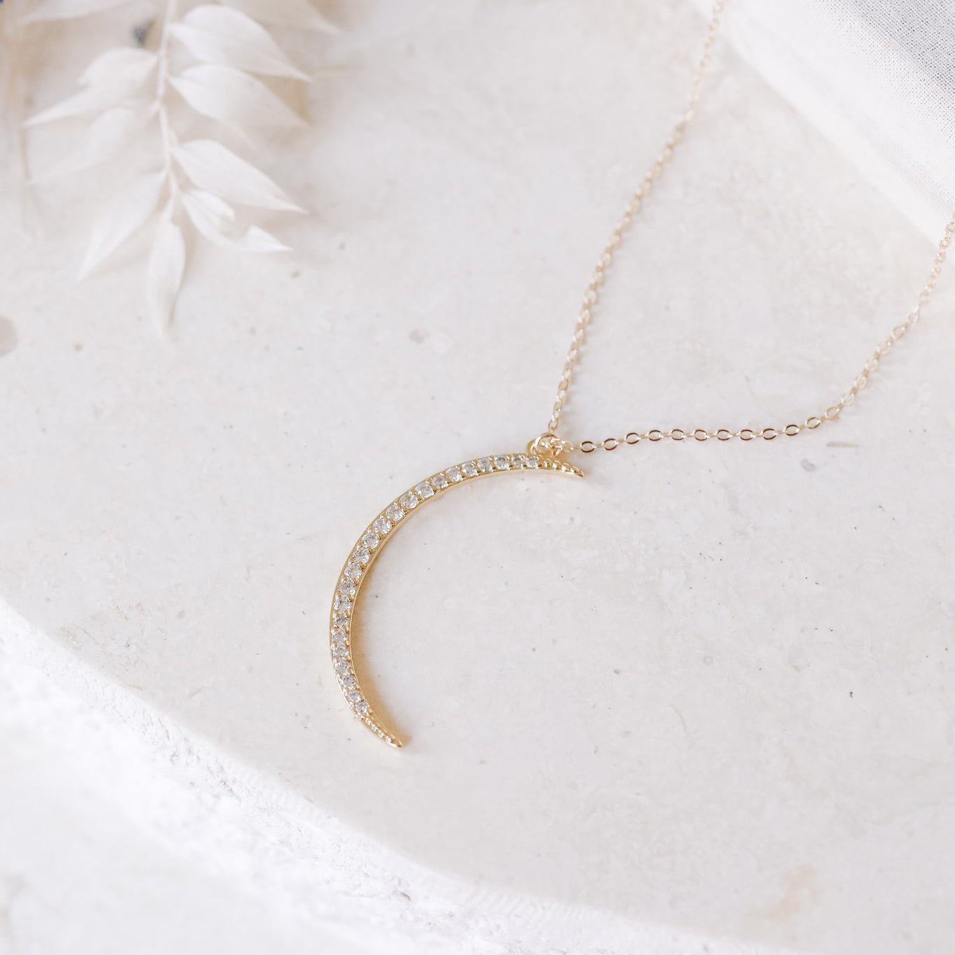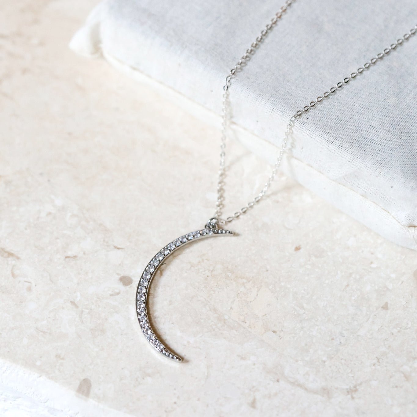 "Crystal Moon" necklace. A large, gorgeously sparkling CZ-encrusted crescent moon necklace in Gold or Silver.