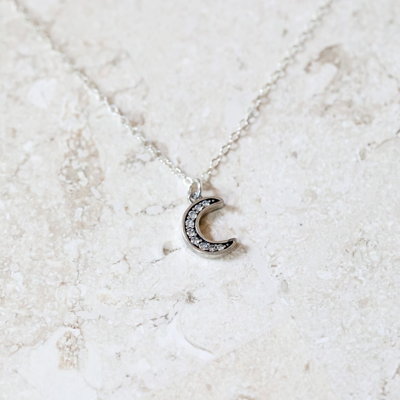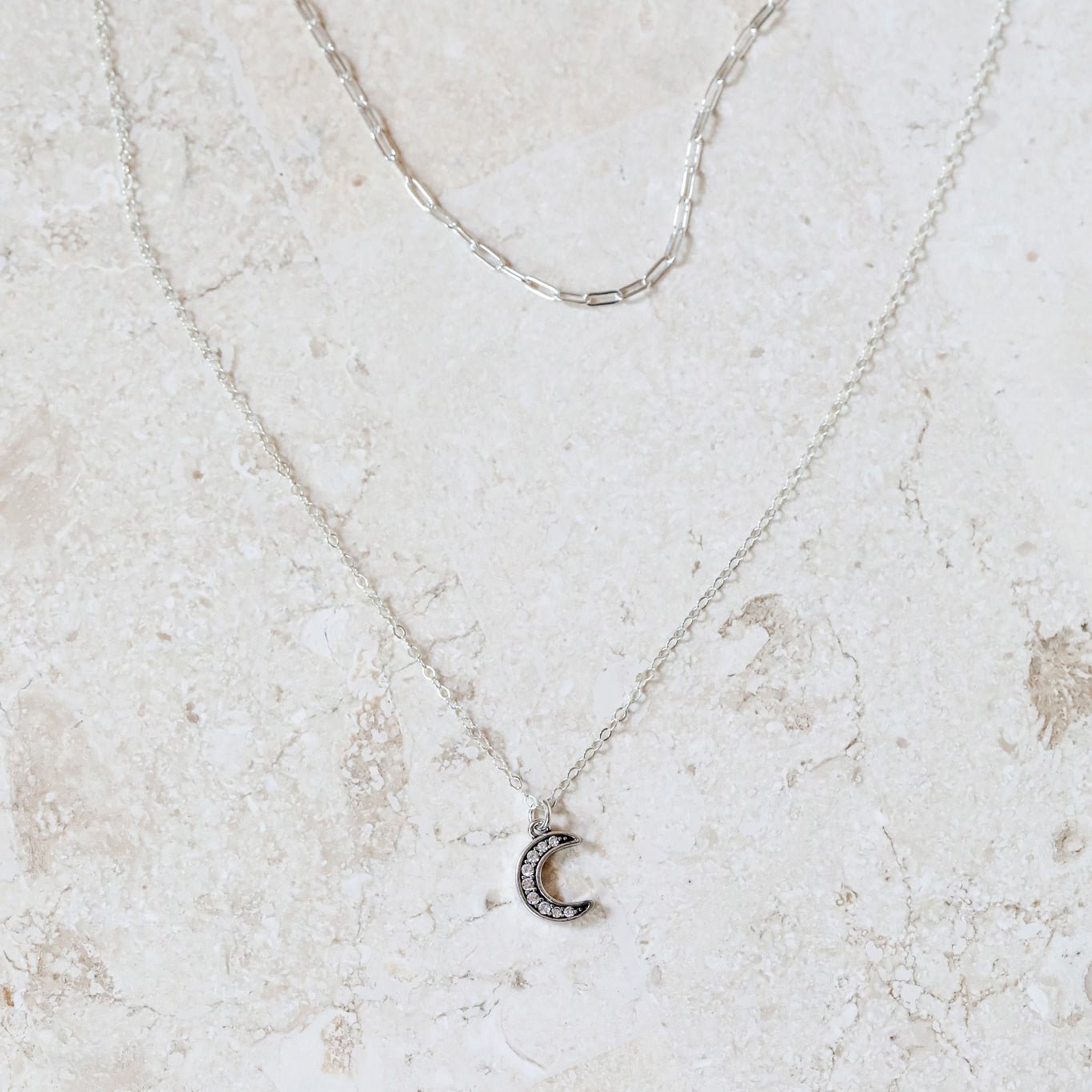 Sterling silver paperclip chain on top, sterling silver cable chain below, with a sparkling crescent moon charm.