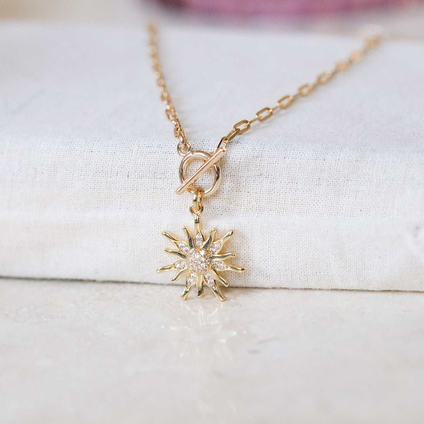 Bright, vibrant, and full of life! A beautiful sun charm pairs with a toggle clasp and gold filled paperclip chain.