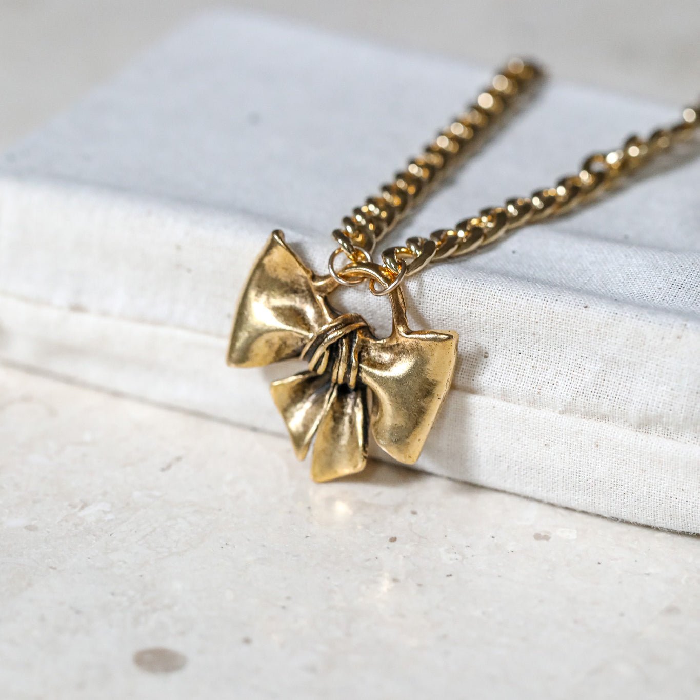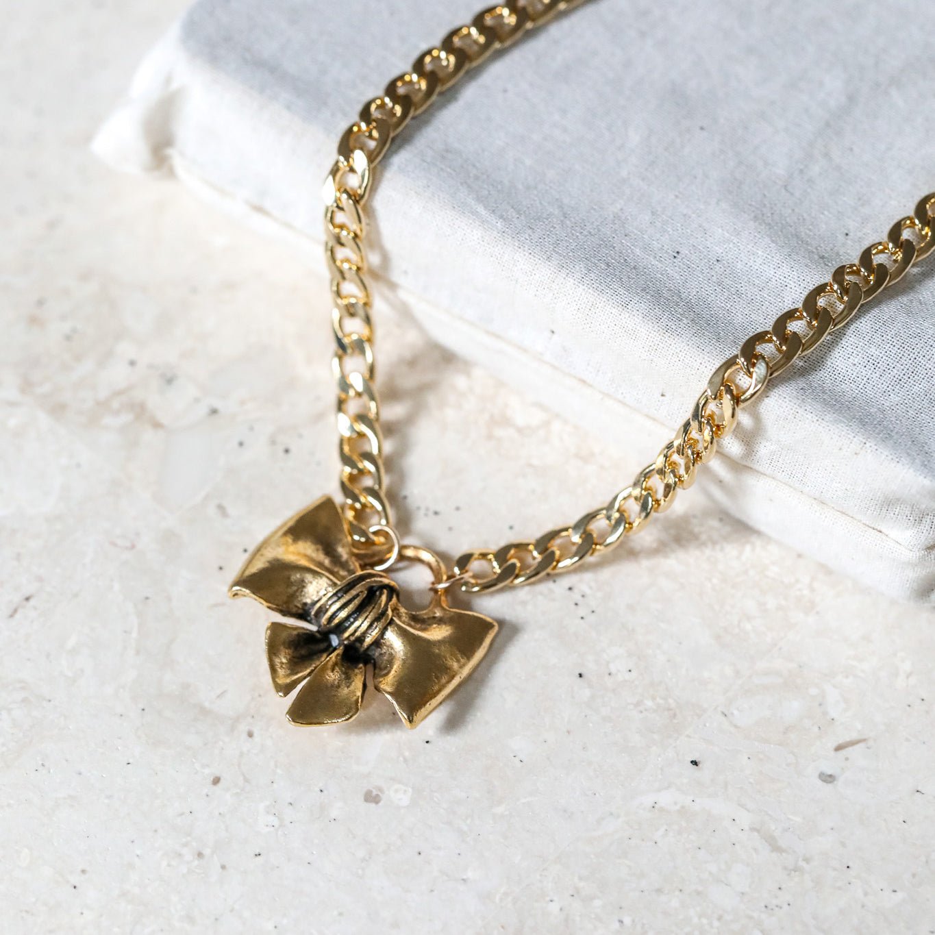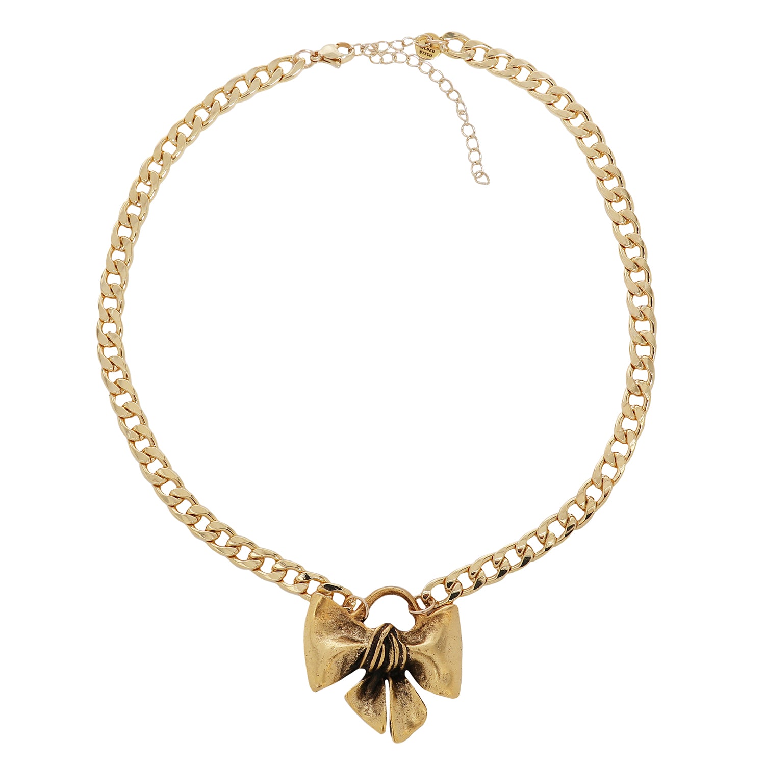A true Holiday necklace!  A large, festive bow charm hangs between chic gold curb chain.  Give them what they really want: You.