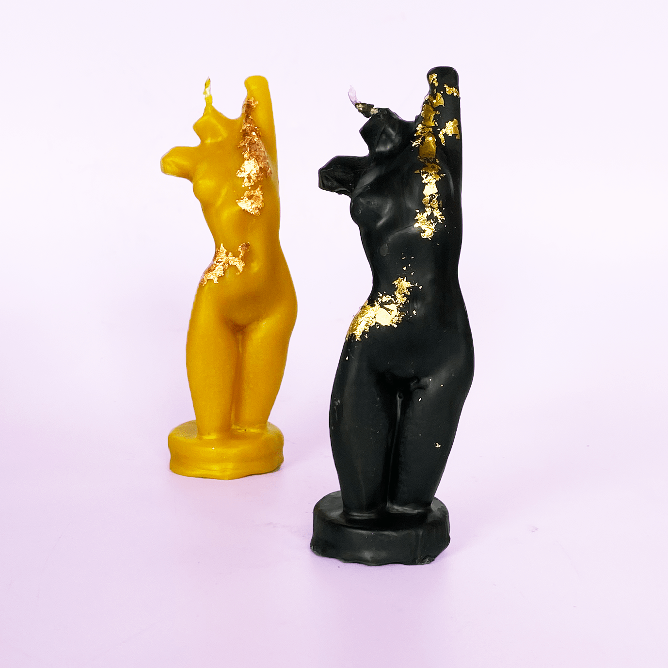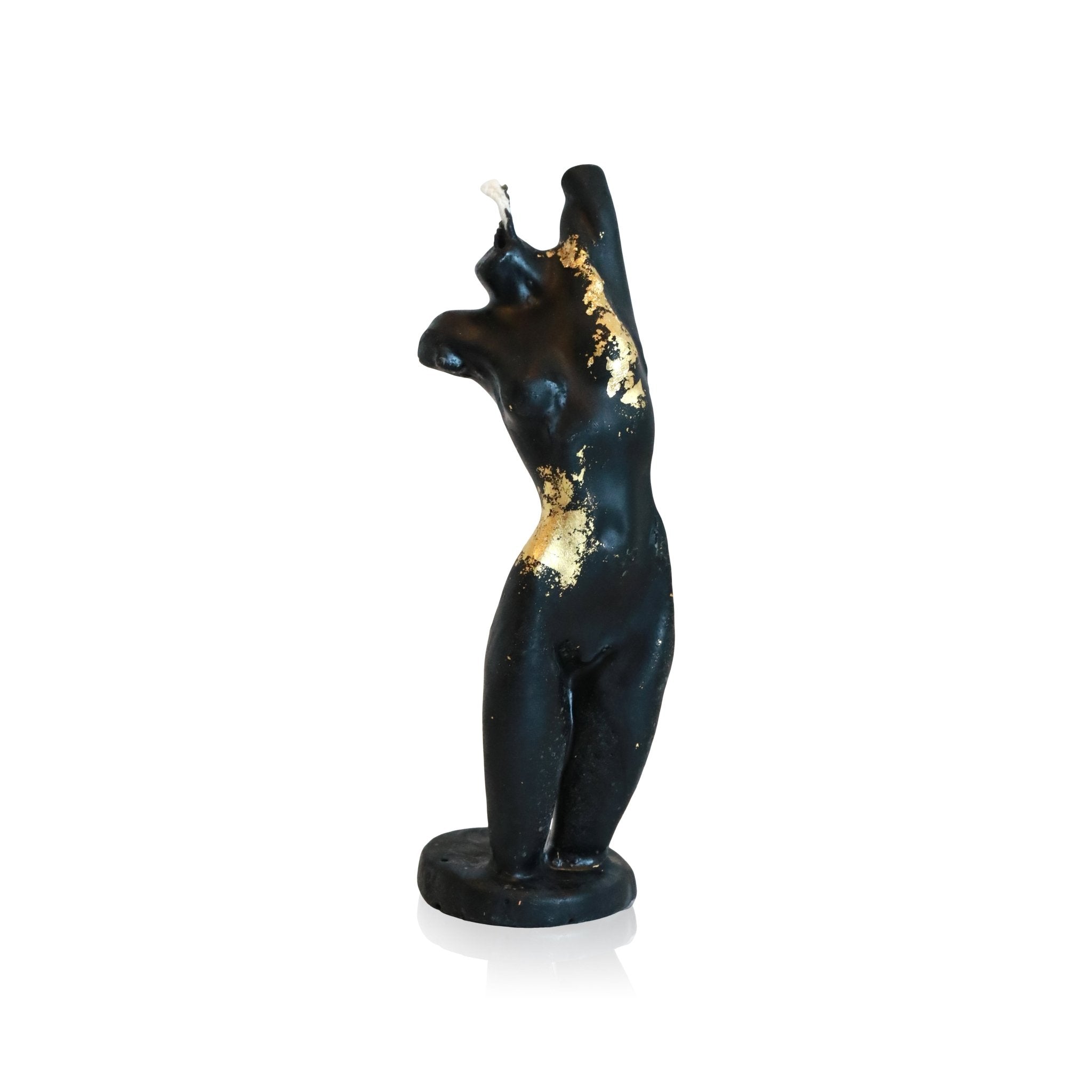 A gorgeous female figure beeswax candle in black and gold, or pure gold.