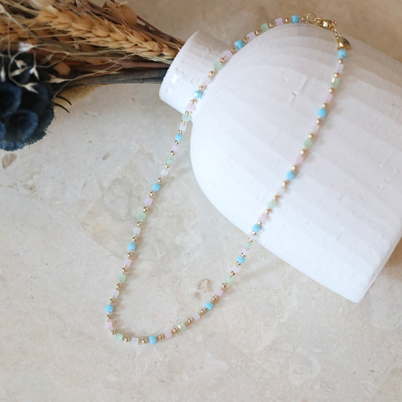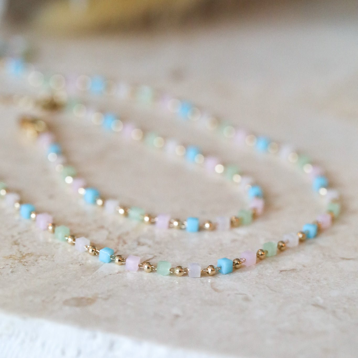 Made for Spring! A quartet of pastel gemstones on a delicate gold plated chain. The necklace has small stones of Mint Quartz, Clear Quartz, Rose Quartz, and Peridot.