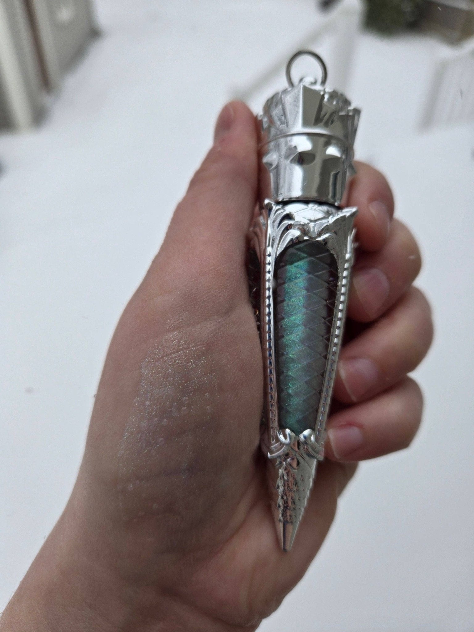 An ethereal lavender & vanilla-scented gothic lip gloss from Petals & Plumes. The CRYSTAL BALL lip gloss has a prismatic iridescent hue and Lavender Vanilla flavor. Housed in their signature gothic potion container.