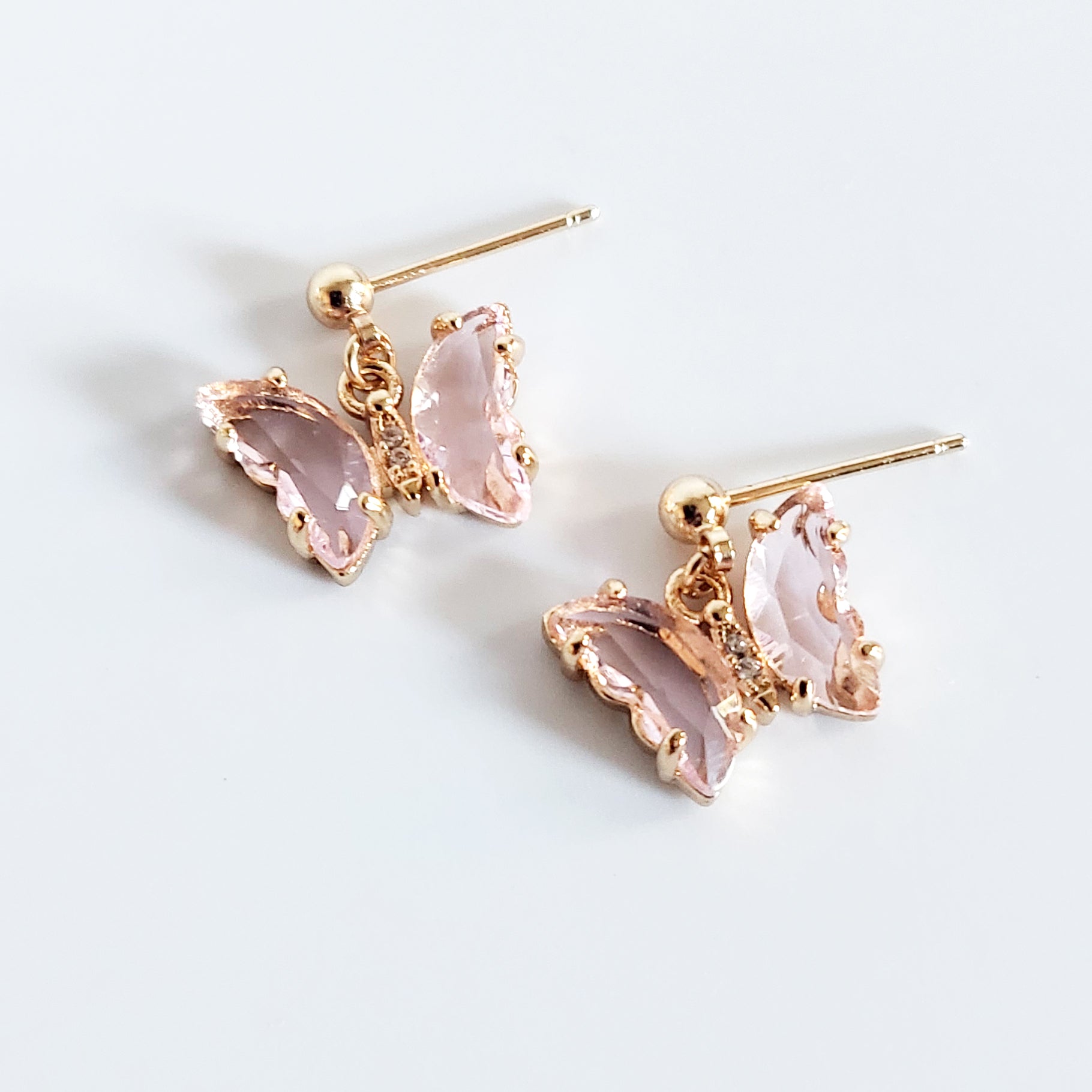 Crystal butterfly charm earrings on 14kt gold filled earring posts.
