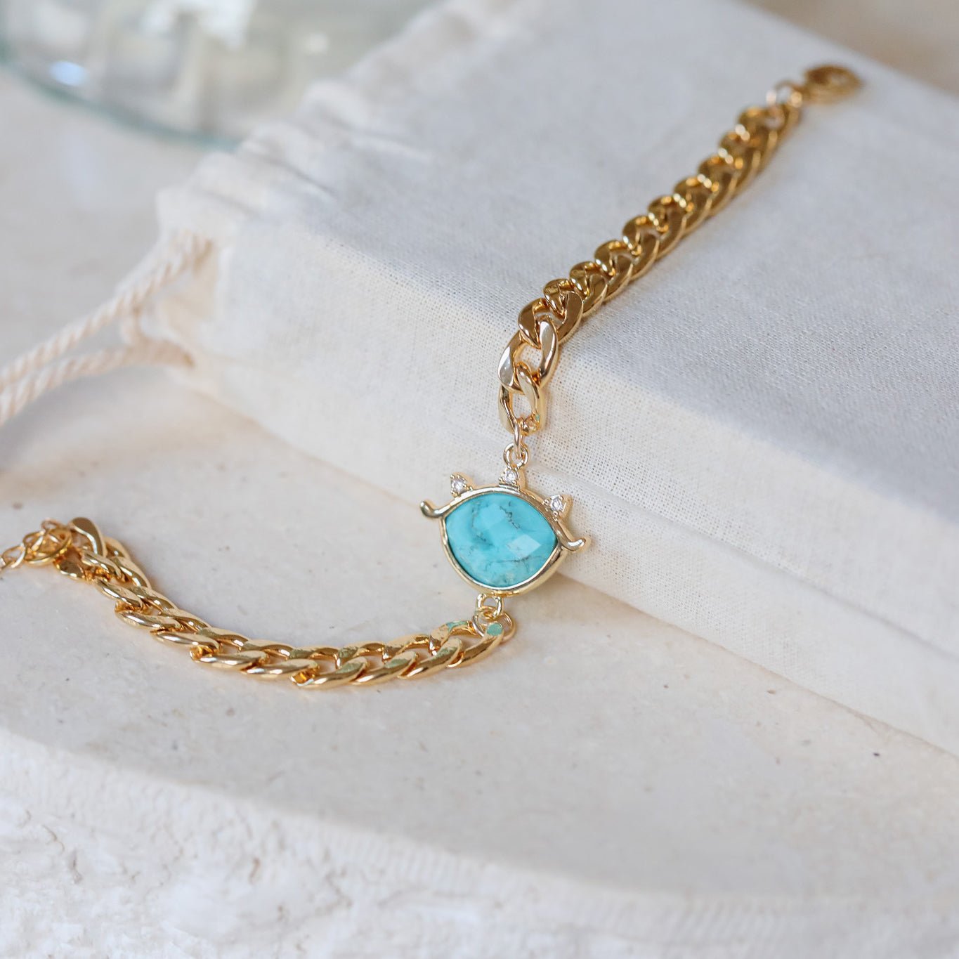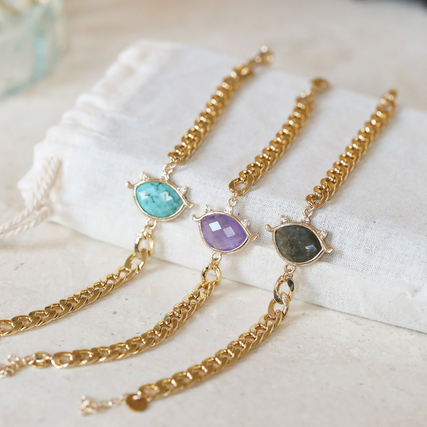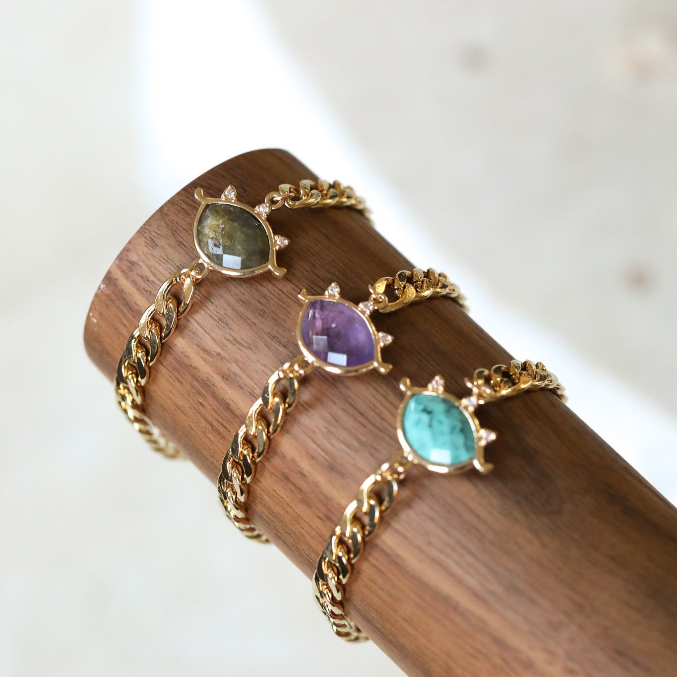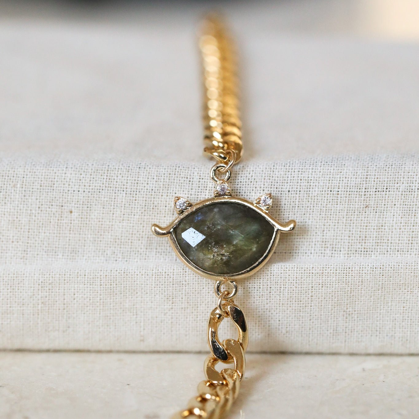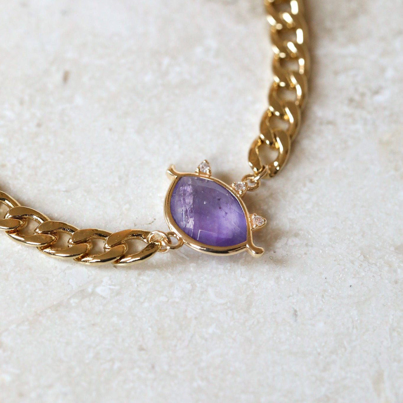 A gold evil eye gemstone bracelet in amethyst, amazonite or labradorite.