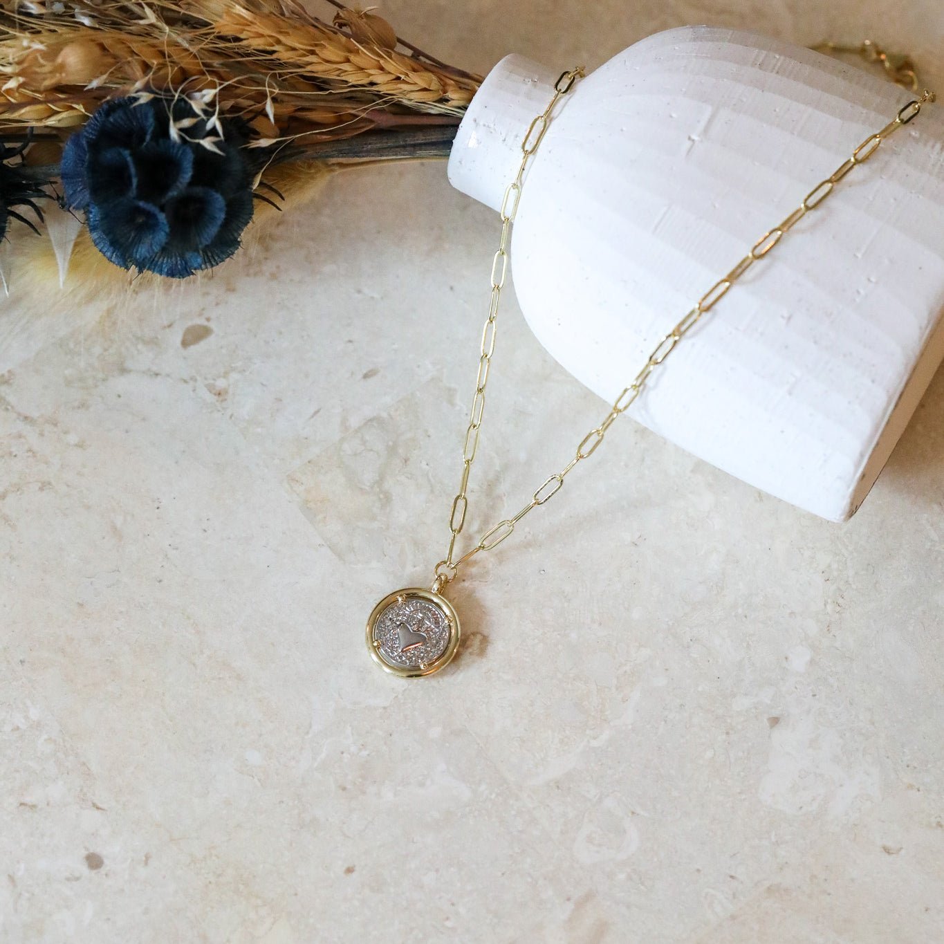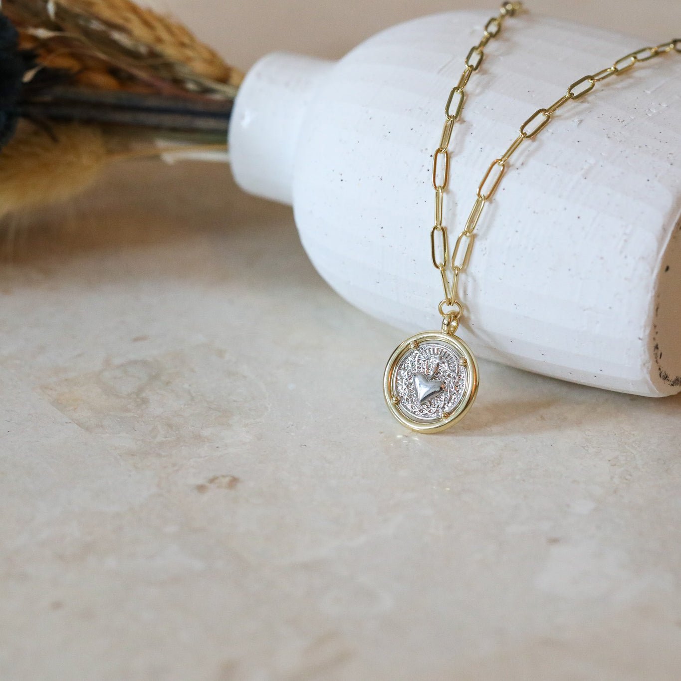 A beautiful gold and silver heart charm on gold filled paperclip chain.  Charm is ~1" in diameter.