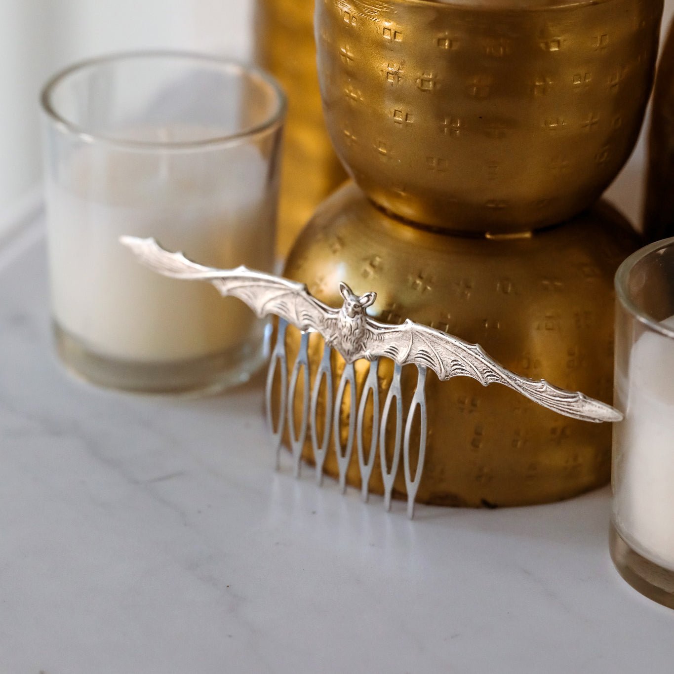 An elegant bat hair comb in gold, silver, black or antique gold.