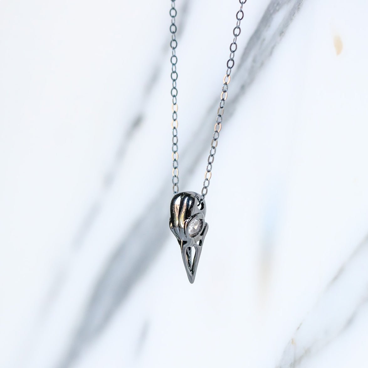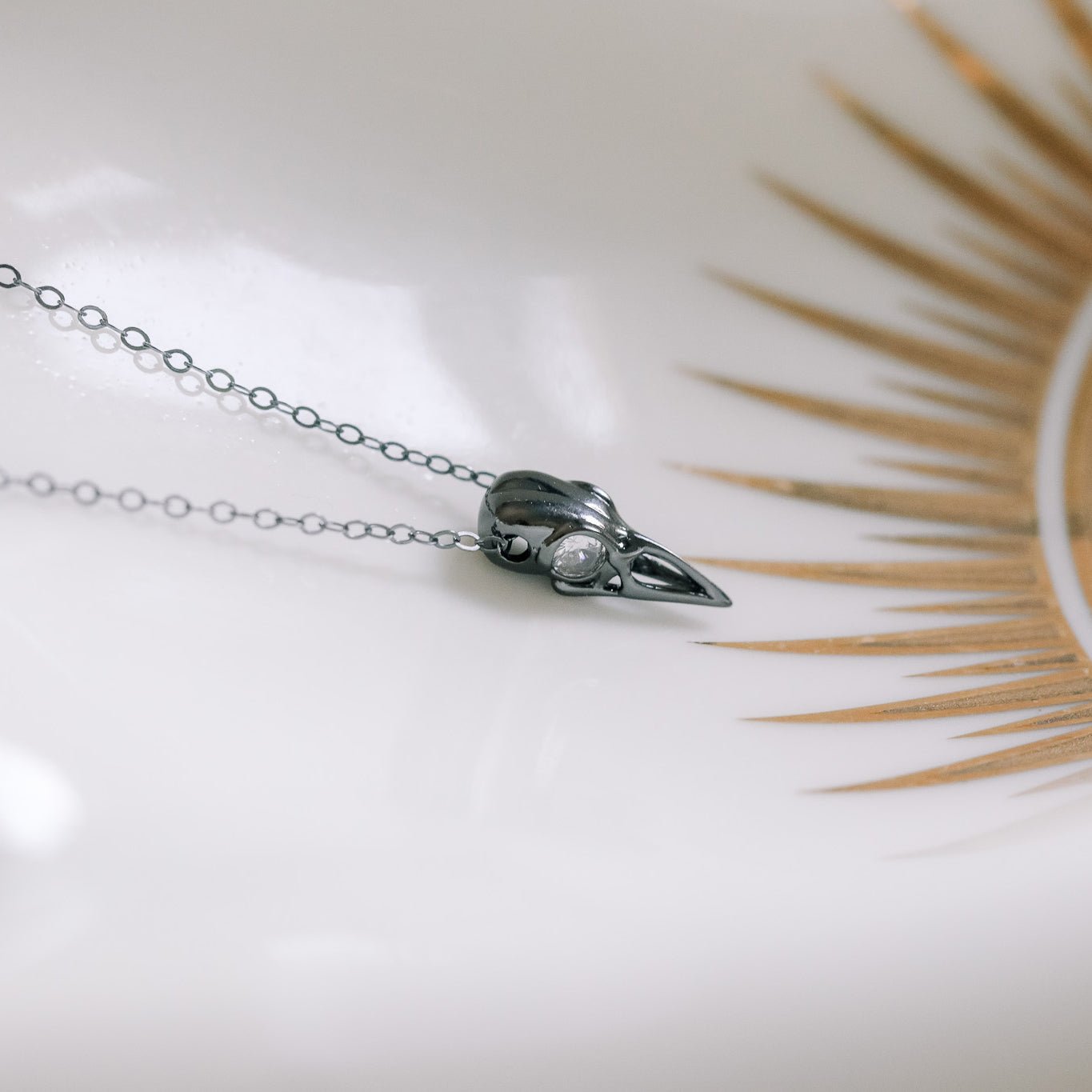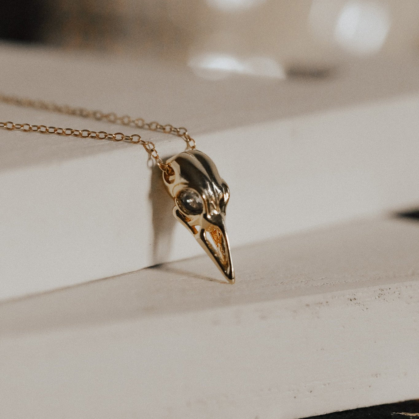 A gorgeous raven skull charm with swarovski eyes slides along a 14kt gold filled chain. It's a glittering, delightfully dark homage to the Poet's favorite. Available in Gold, Sterling Silver or Raven Black.