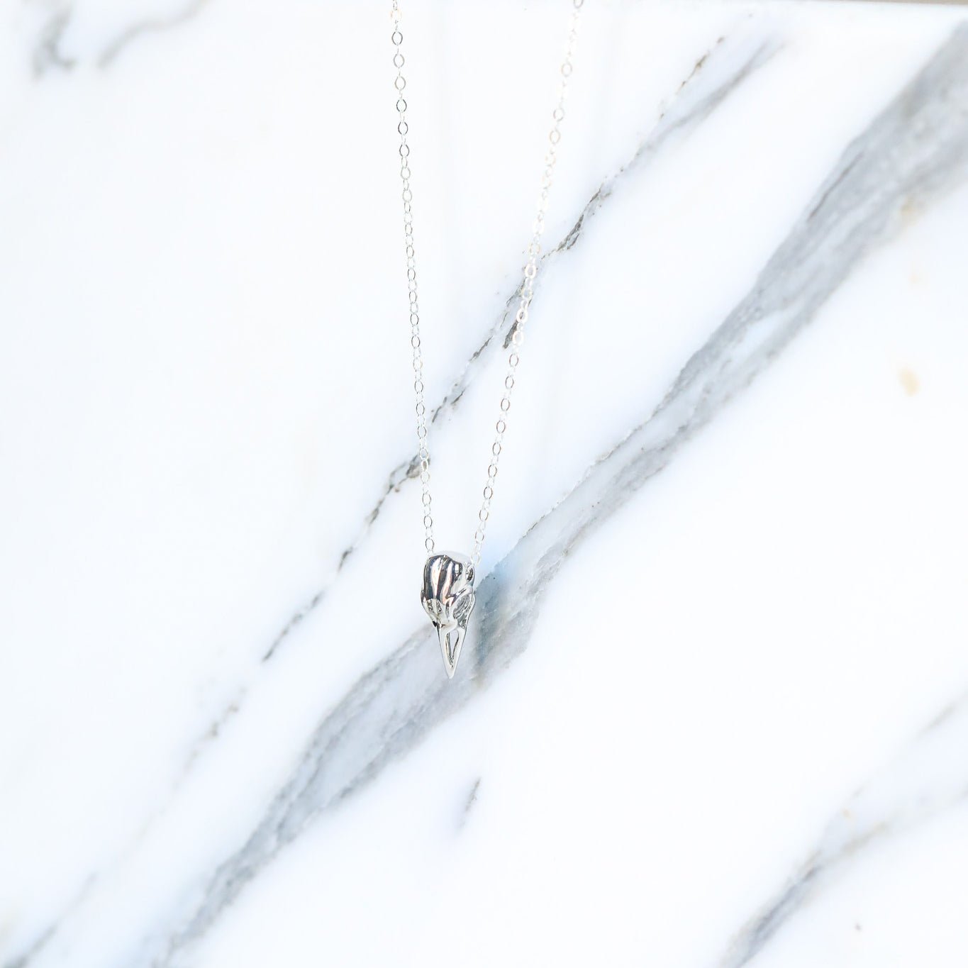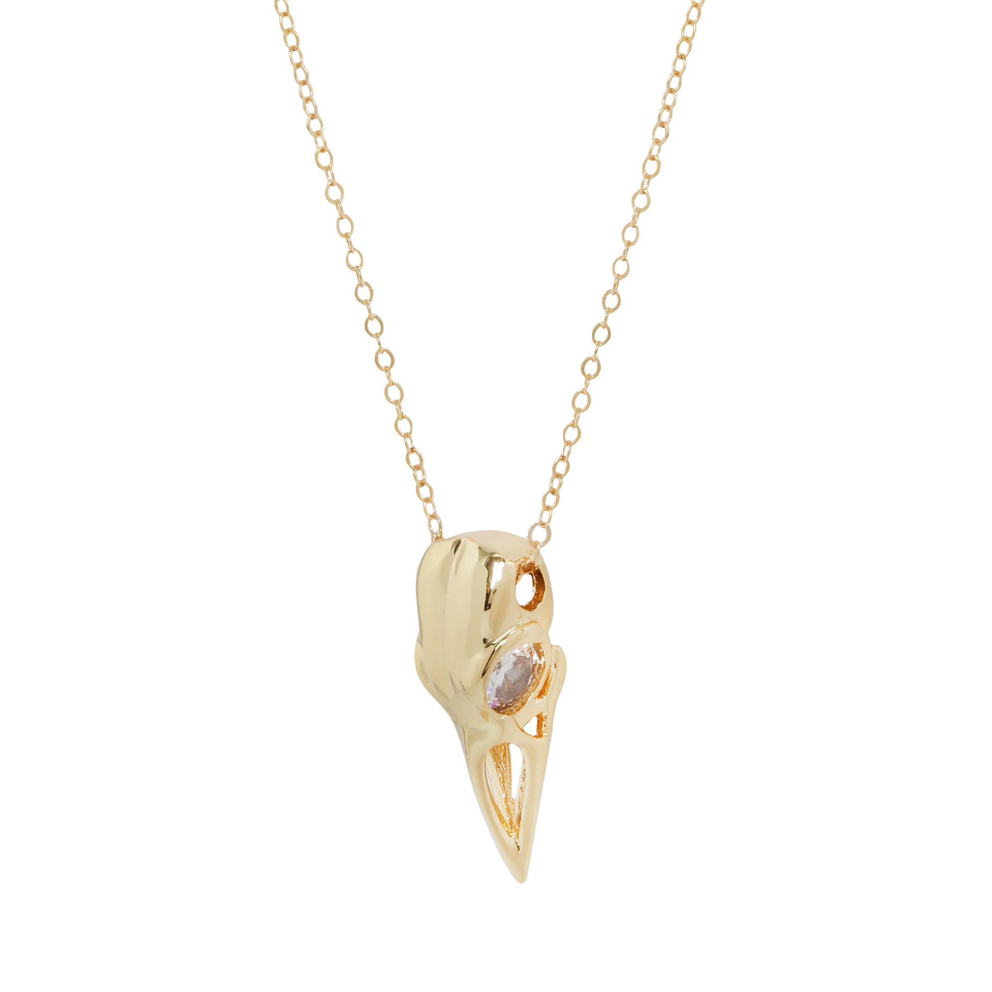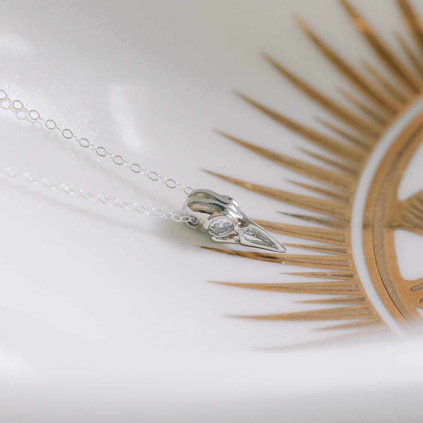 A gorgeous raven skull charm with swarovski eyes slides along a 14kt gold filled chain. It's a glittering, delightfully dark homage to the Poet's favorite. Available in Gold, Sterling Silver or Raven Black.
