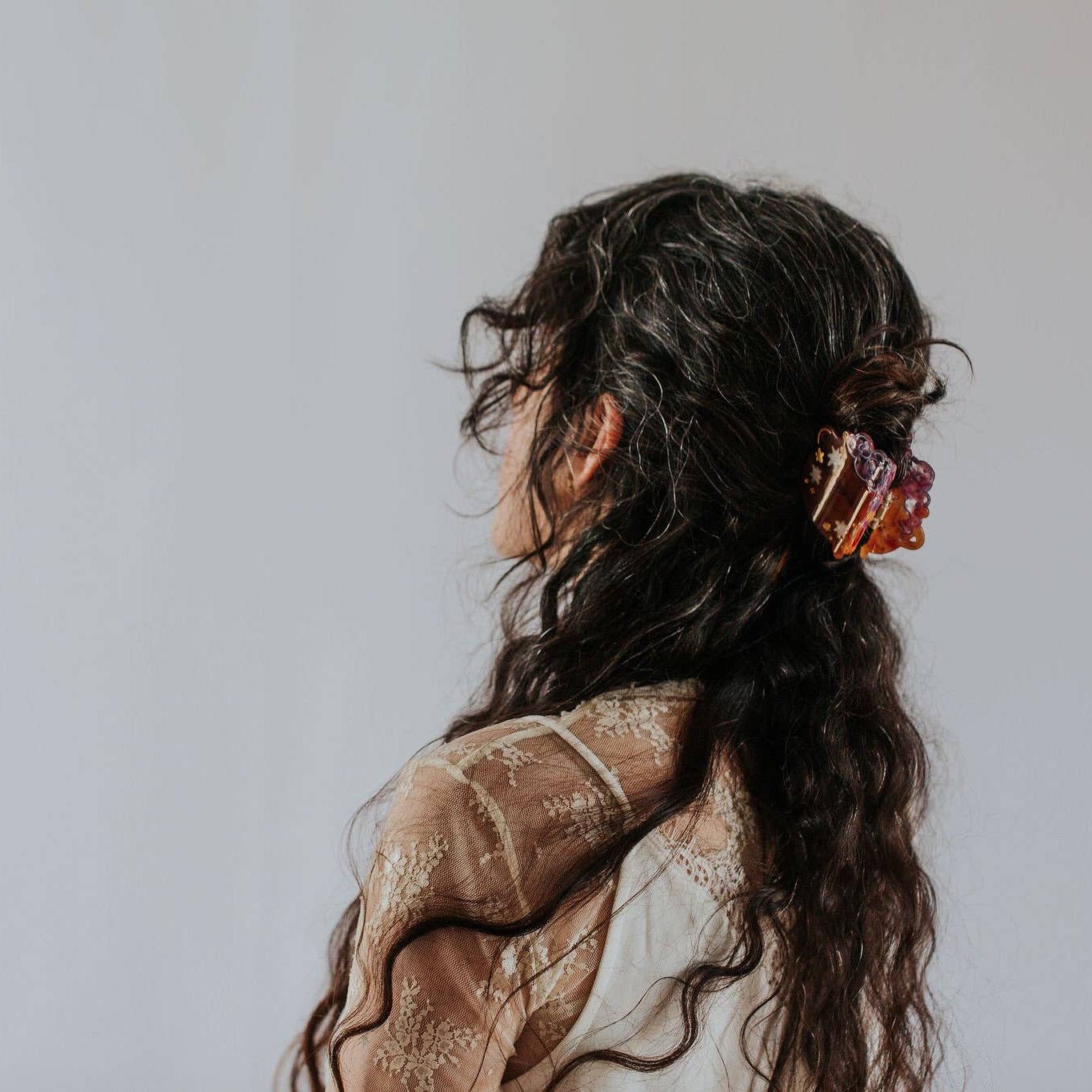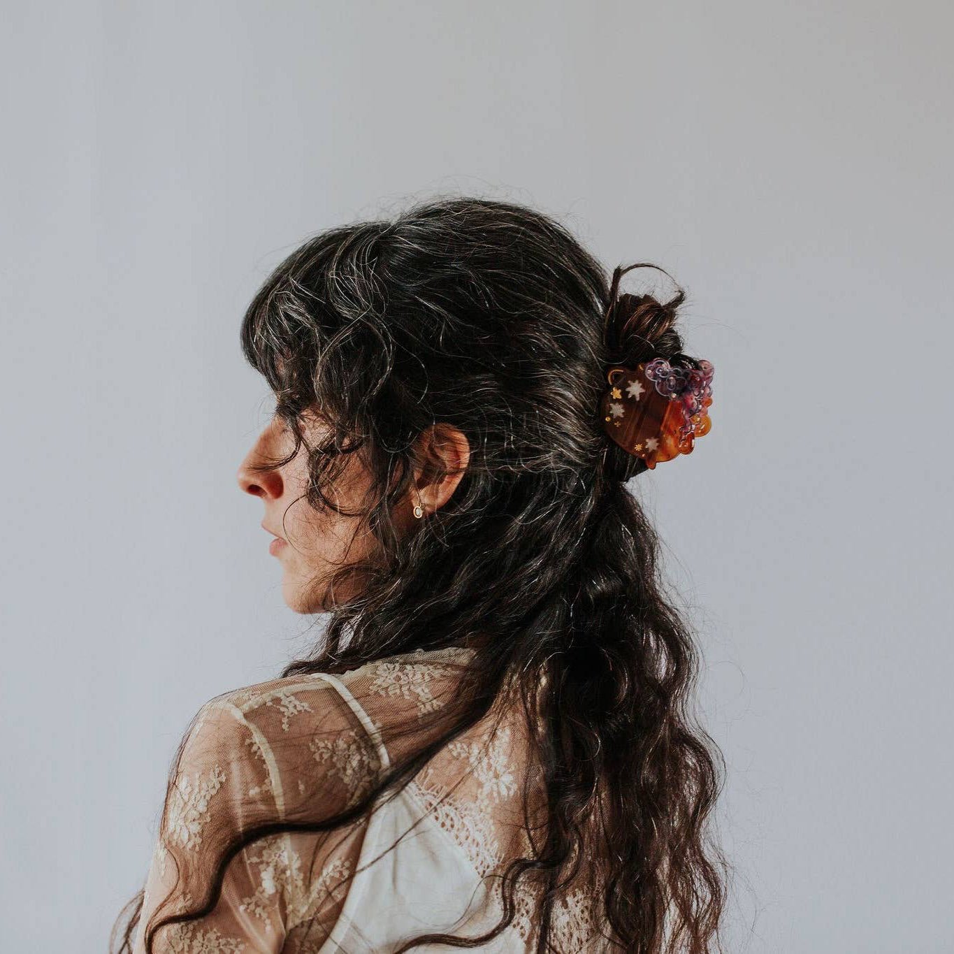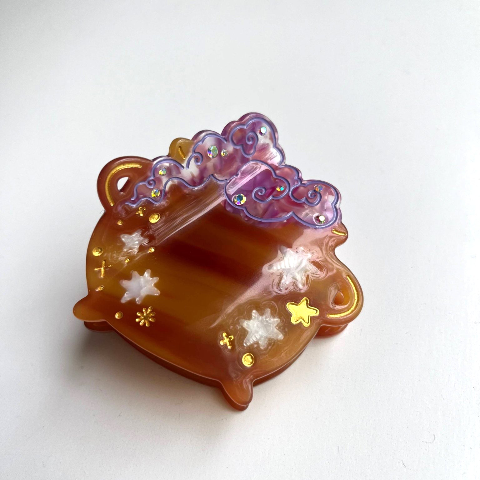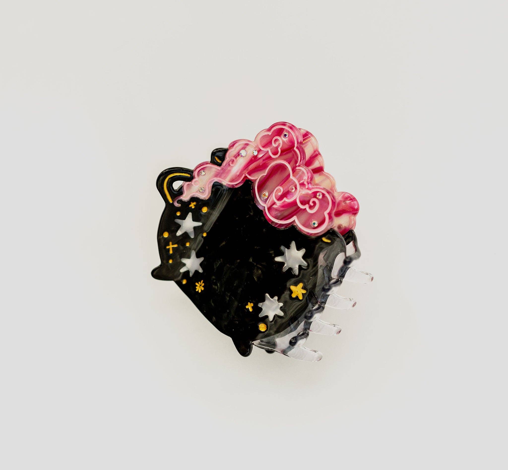 Bewitch your lazy hair days with the Cauldron Claw! A medium-sized claw clip with semi-transparent smoke flowing from a cauldron. Surrounded by stars and gems. Available in Honey-Bown and Purple, or Black and Pink ✨
