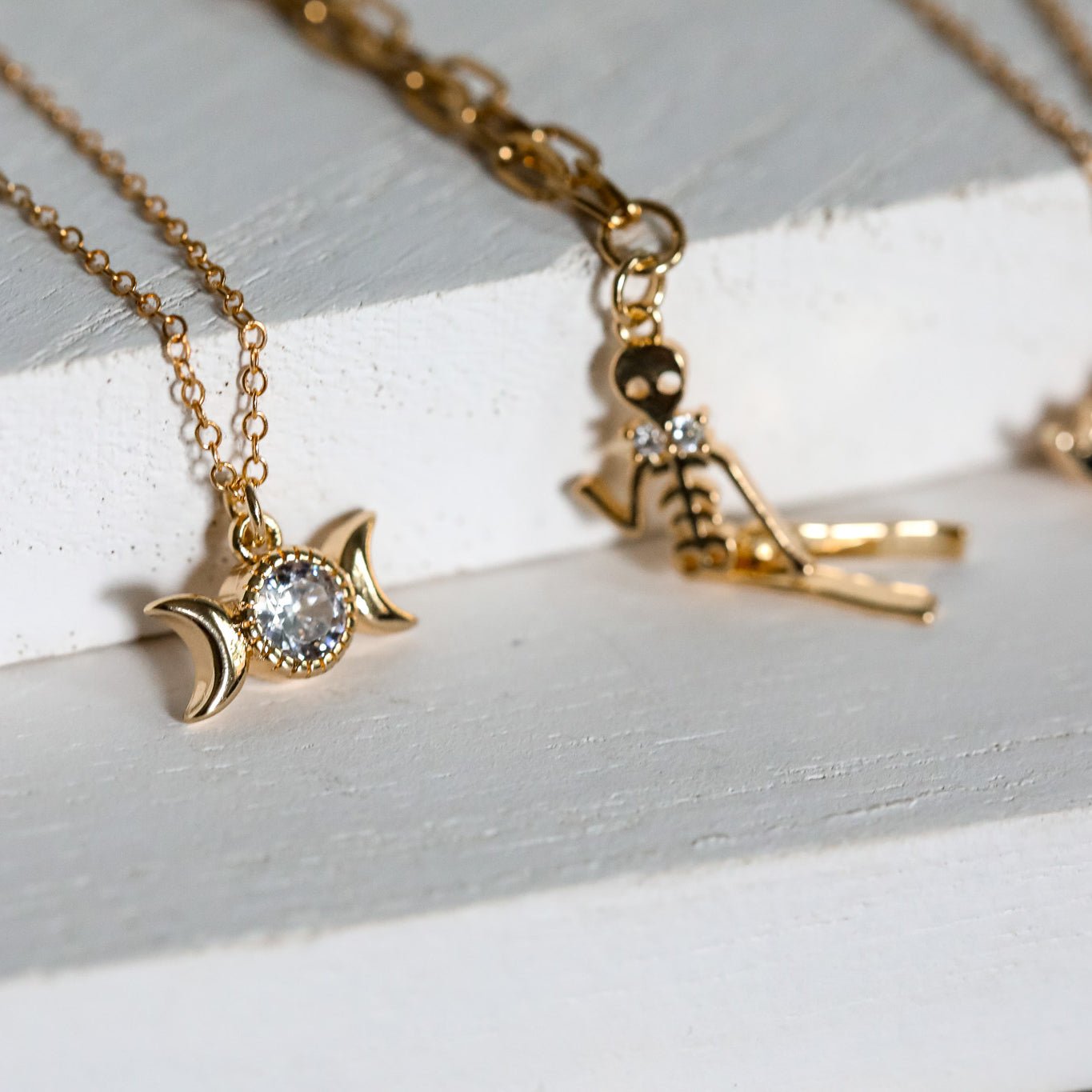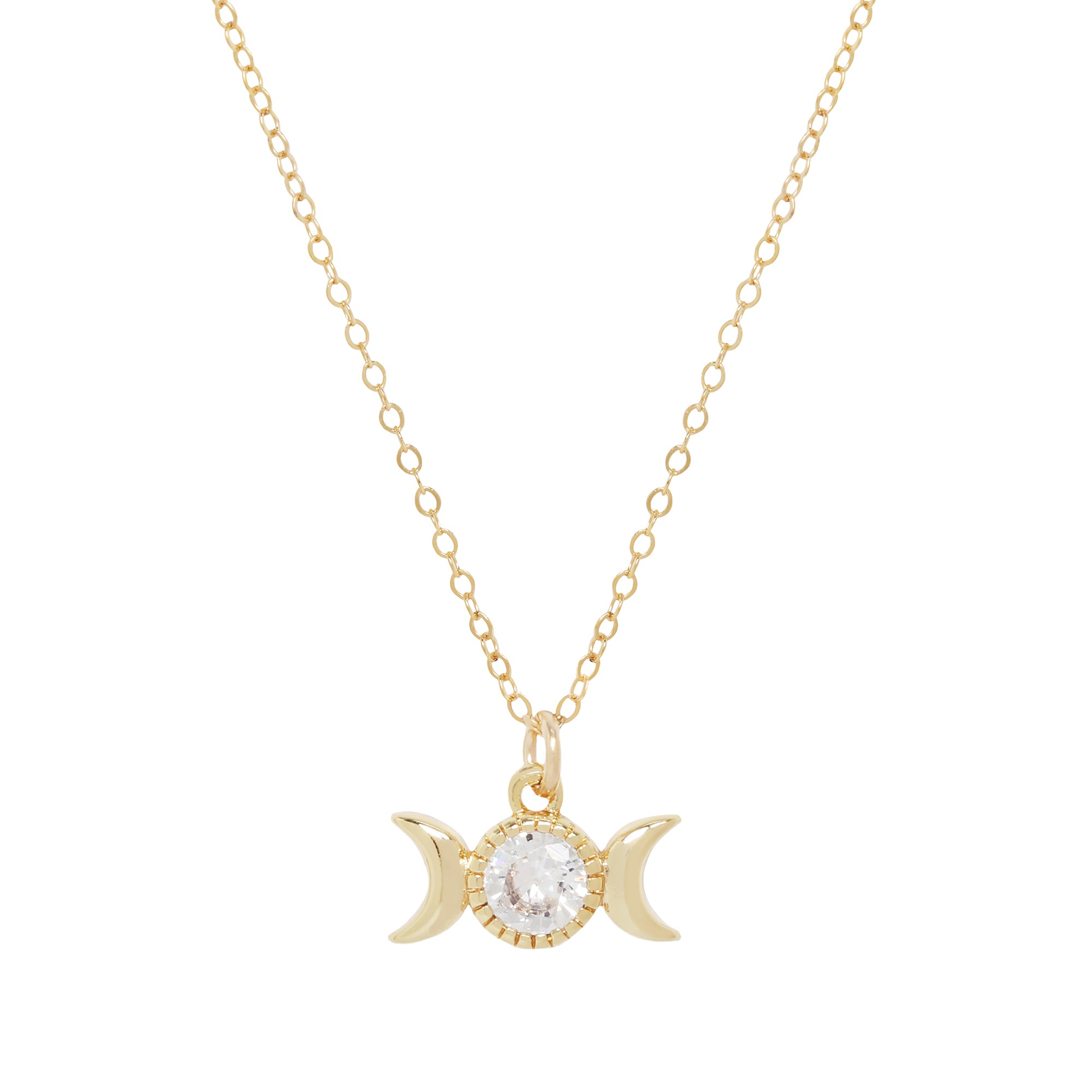 A beautifully delicate triple goddess moon charm necklace. The chain is 14kt gold filled. A perfect layering piece.